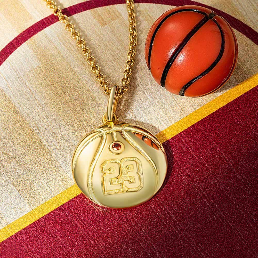 -Detta basket unisex halsband utsmyckat med basketmönster, spelarnummer, gnistrande födelsesten och anpassad gravyr kan användas för att fira basketens ungdom.