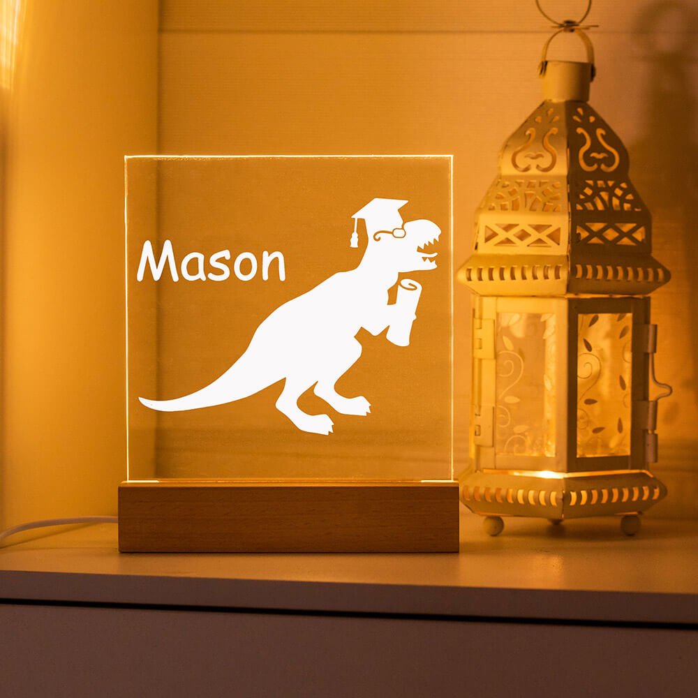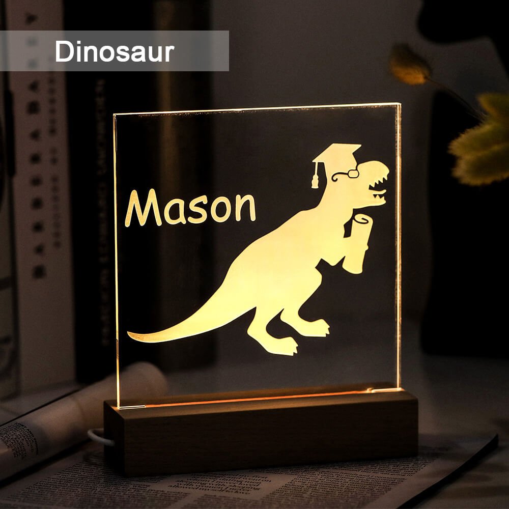 -Denna Callie nattlampa är utformad som en speciell present till barn. Att sova med en dinosaurie är de flesta barns dröm. Serietidningen av en dinosaurie med glasögon och trencherkeps visar livligt en kunnig egenskap hos barnen. Lämplig för din lilla student. Gravering med barnets namn på lampan ger en unik ton för den söta drömmen som börjar med den varma lampan. När mörkret kommer kommer namnet på din betydande person att tändas med denna söta lampa.