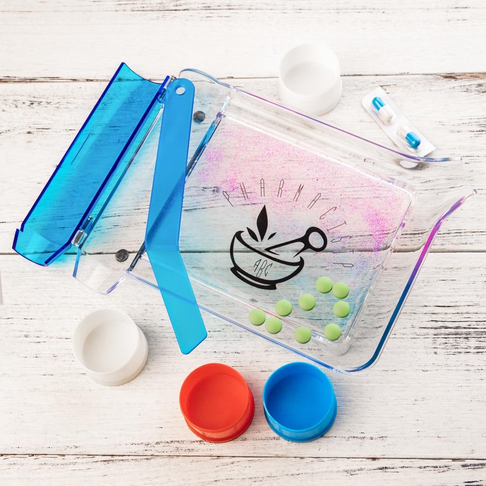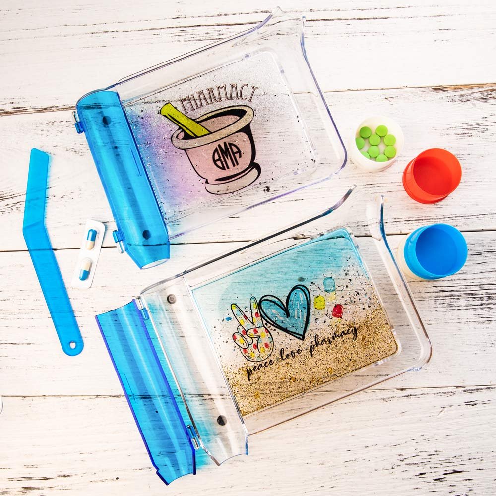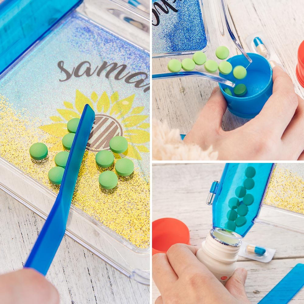 Channel in lower left corner is for pouring the pills/tablets into daily pill box. Channel in top right corner is for pouring the rest pill back into original pill vial. Hands will not touch pills in whole counting process, making pill counting work more sanitary & efficient. The plastic handle spatula helps counting pills more comfortable.