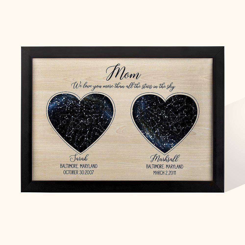 We provide two styles, dad and mom, which you can choose according to your personal needs. We also provide different shapes of graphics to show the star map(heart-shaped and circular). The most special thing is that you can choose the number of different star skies according to the number of people you need, and under each star map pattern, you can set the name, location, and specific date.