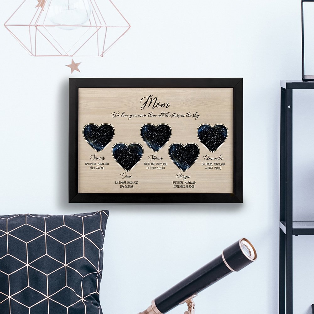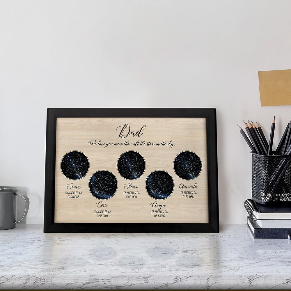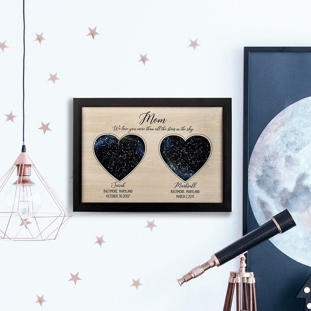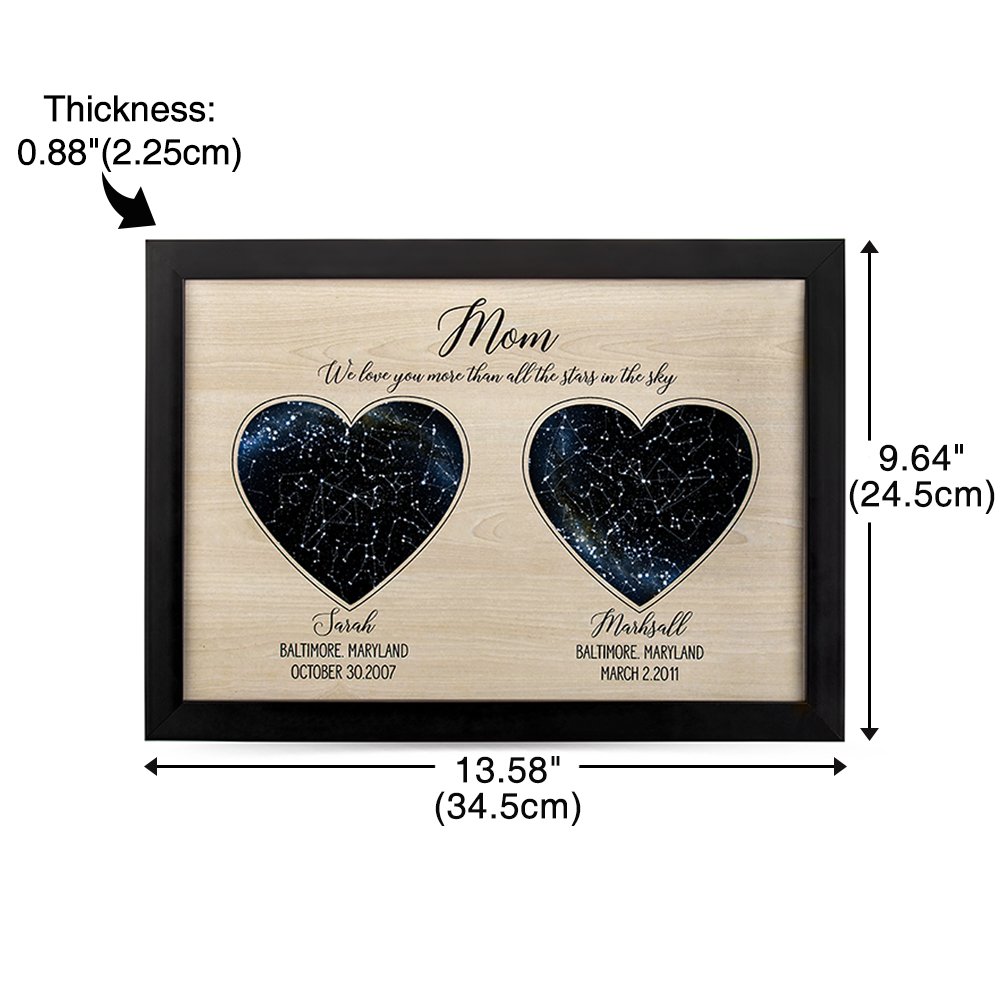 We provide two styles, dad and mom, which you can choose according to your personal needs. We also provide different shapes of graphics to show the star map(heart-shaped and circular). The most special thing is that you can choose the number of different star skies according to the number of people you need, and under each star map pattern, you can set the name, location, and specific date.