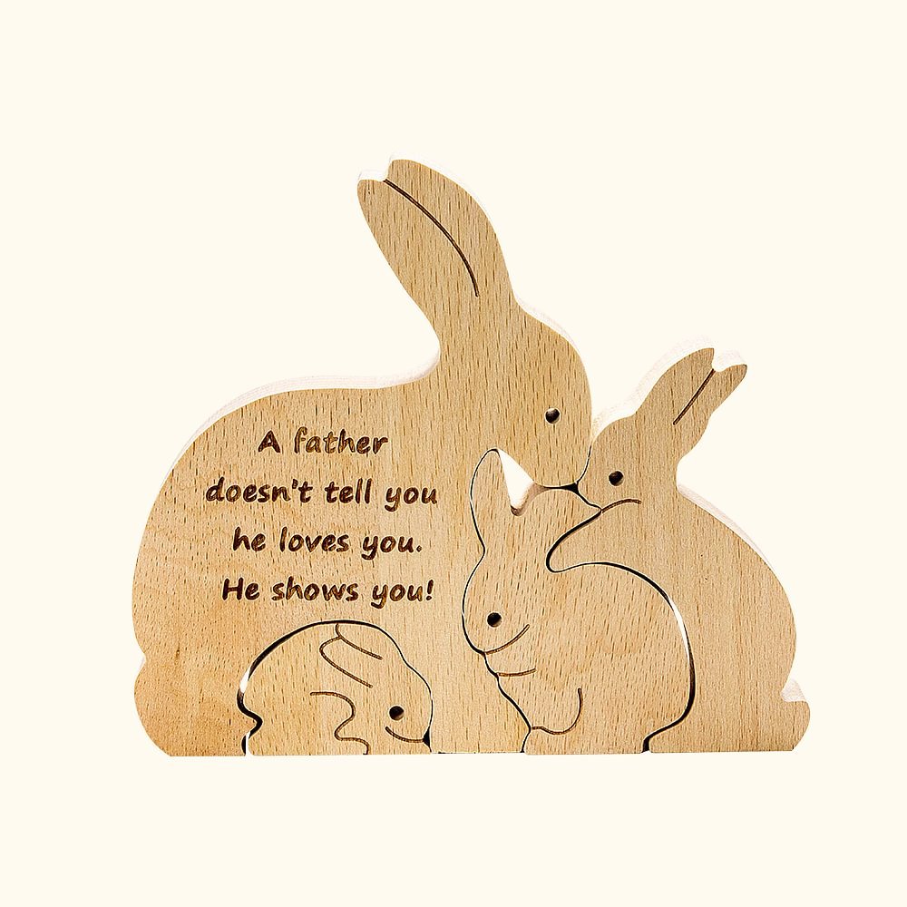 - Denna familjekanininredning är tillverkad av trä, lätt, stark och hållbar och skadas inte lätt. I designen representerar de två större kaninerna mor och far, medan de små kaninerna som ligger i deras armar representerar barn och barn. Innebörden uttrycker familjens harmoni och värme men visar också föräldrarnas oändliga kärlek till sina barn och deras beroende av sina föräldrar. Samtidigt kan denna dekoration också användas som en pusselleksak för dina barn att leka och utveckla sin intelligens i underhållning.