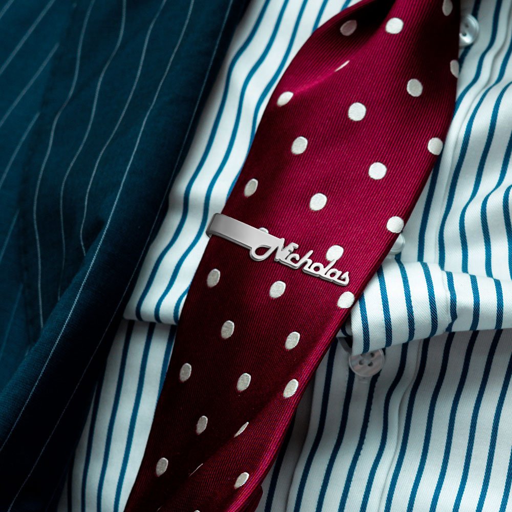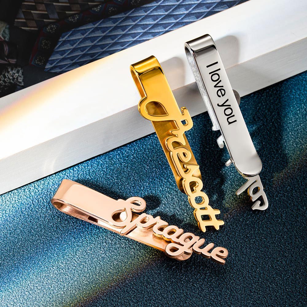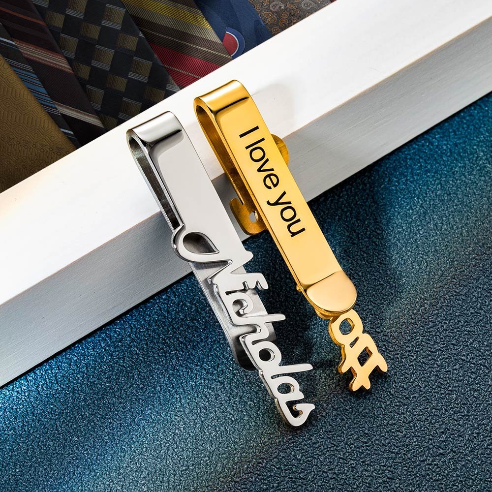 Slipsklämmans framsida kan anpassas med gåvomottagarens namn och baksidan kan graveras med ett stycke, som kan vara vad du vill säga till gåvomottagaren, eller ett motto etc.
