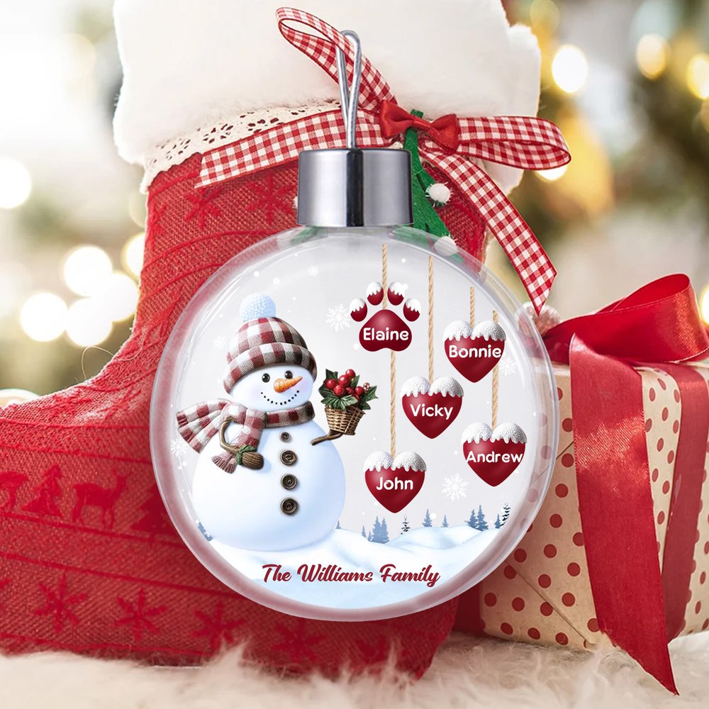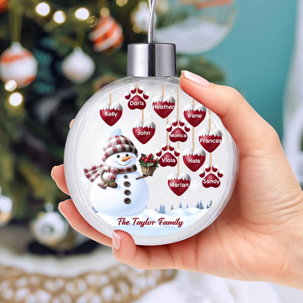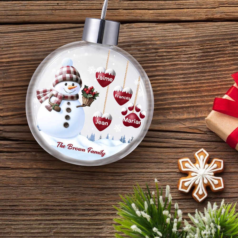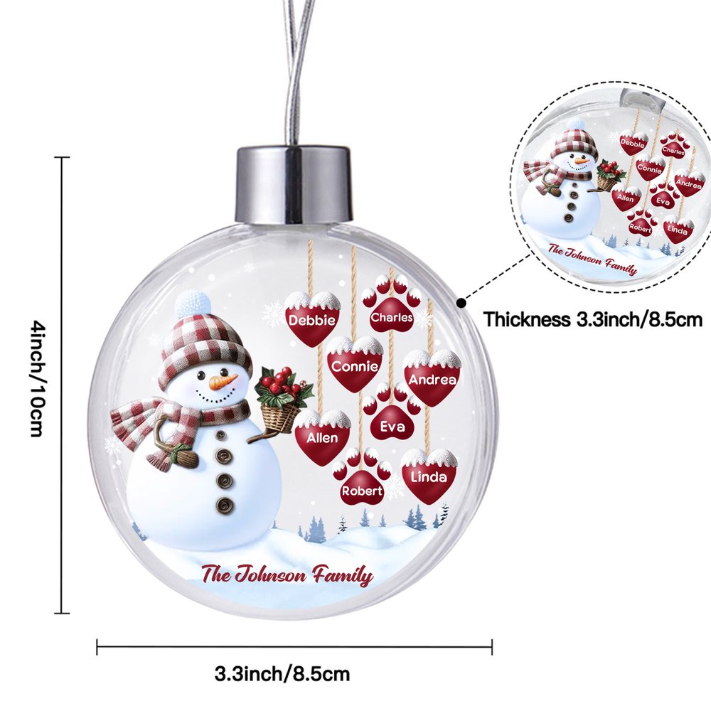 Denna julgransprydnad innehåller smarta designelement som en snögubbe, tassavtryck och hjärtan, vilket förmedlar ett varmt och vackert budskap. Du kan också anpassa tassavtrycket eller hjärtat med namnet på en familjemedlem eller vän, och texten med din familjs efternamn nedan. Gör varje användning av denna prydnad till ett hjärtevärmande minne av familjens kärlek.