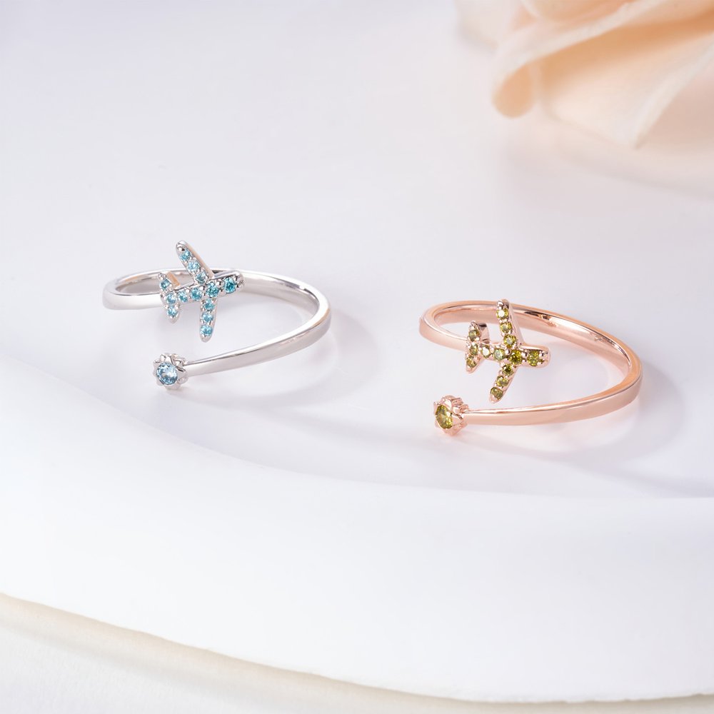 Ringen har en dynamisk flygplansform och är infattad med några skimrande födelsestenar, vilket skapar en unik flygplansestetik. Den öppna designen möjliggör inte bara enkel justering för att passa olika fingerstorlekar utan bidrar också till designens uppfinningsrikedom. Den övergripande designen är flytande och dynamisk och framkallar illusionen av ett flygplan som svävar mellan dina fingrar.