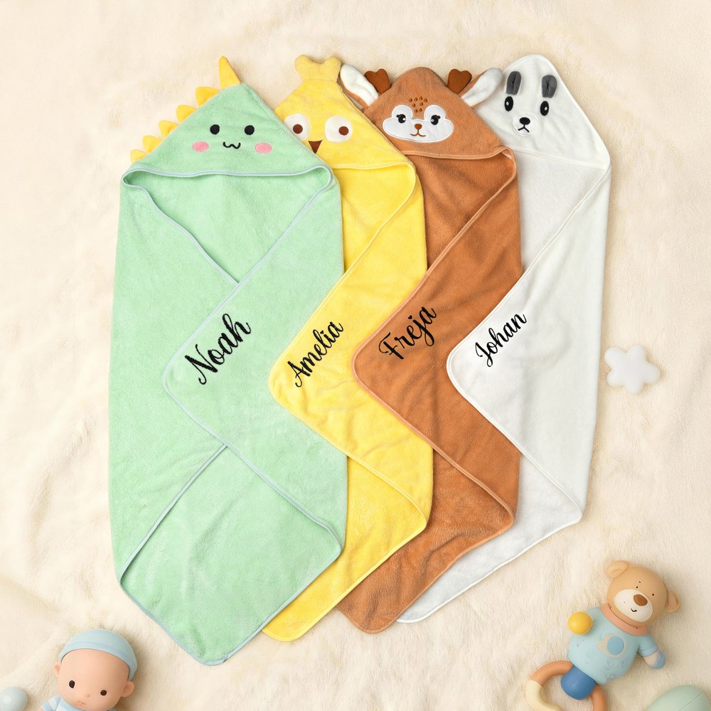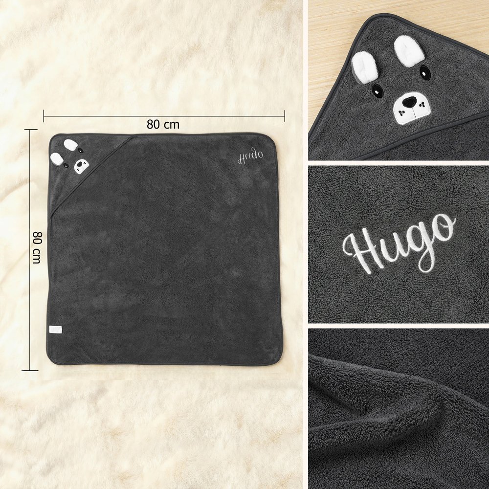 Denna charmiga badhandduk med djurhuva är inspirerad av djurens värld och sprider glädje med sitt lekfulla uttryck. Huvan omsluter barnets huvud på ett mjukt och värmande sätt efter badet, medan de söta 3D-detaljerna ger handduken en livfull karaktär. Genom att lägga till barnets namn skapar du en helt unik och personlig ägodel - en hjärtvärmande gåva som sticker ut.