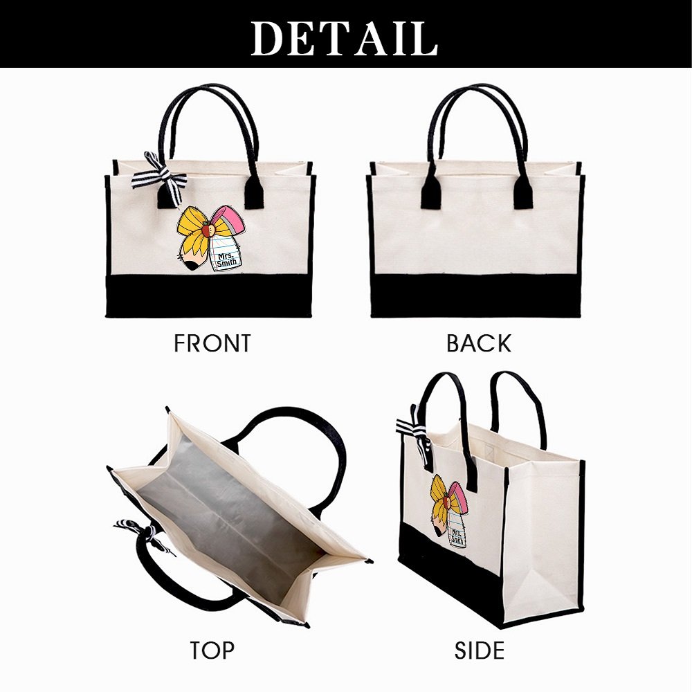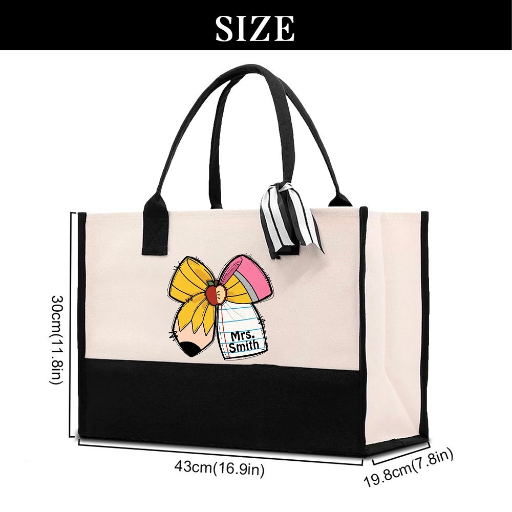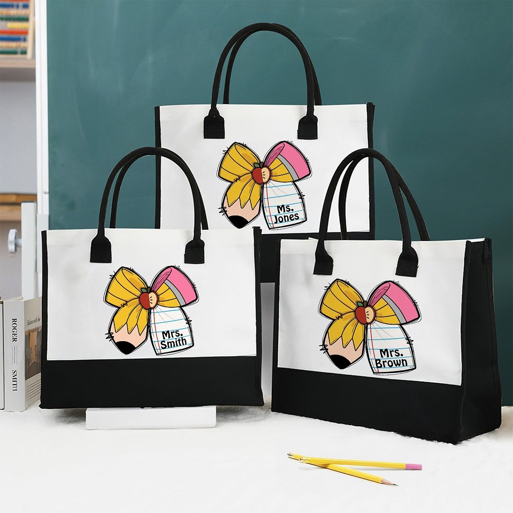 Denna svartvita tygväska har en rosett- och penndesign som blandar mjukhet med pedagogiska element och framhäver lärarnas yrkesidentitet. Namnet kan anpassas på "anteckningspapper"-mönstret, vilket gör varje väska unik och personlig.