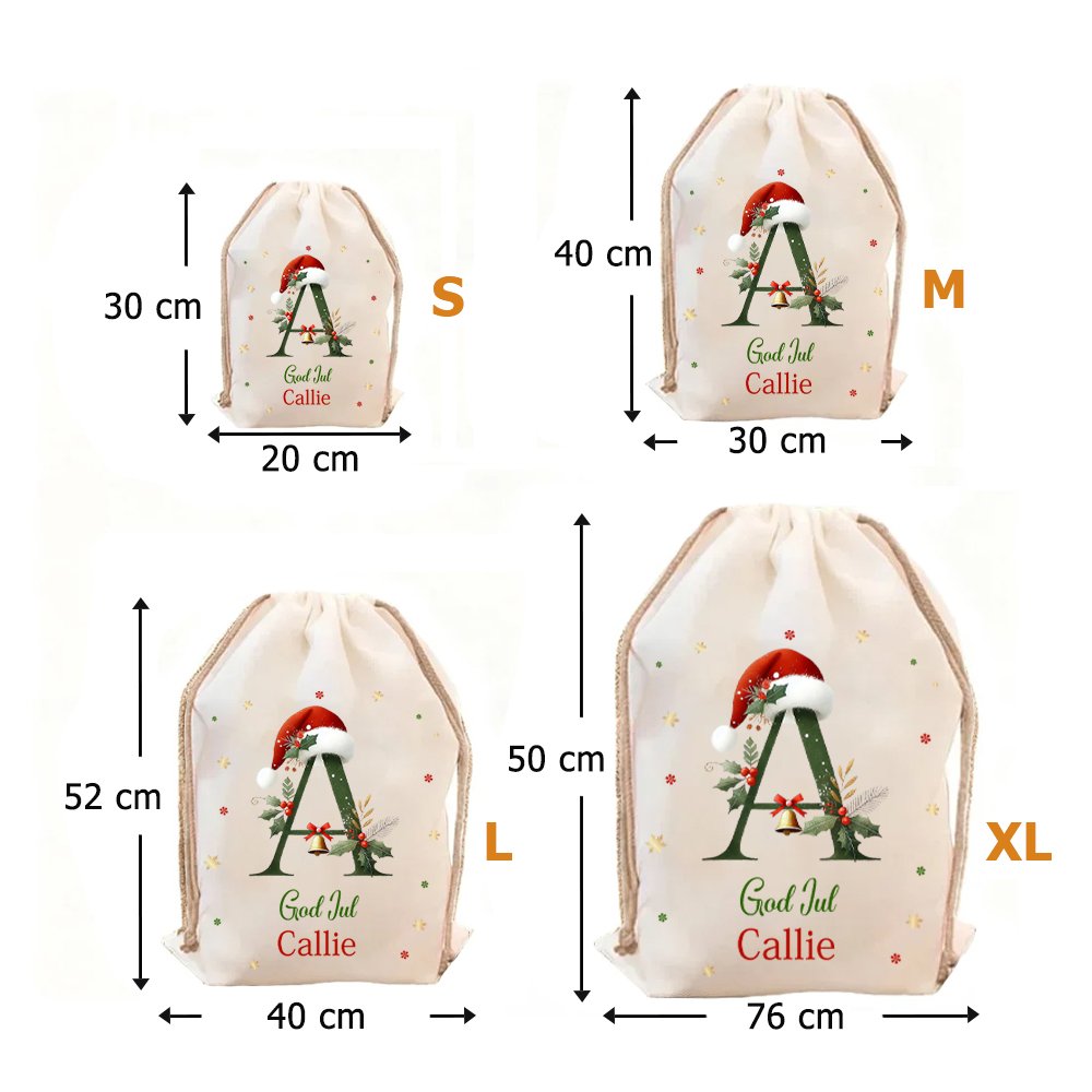 Denna unika presentpåse låter dig anpassa den med egna initialer, namn och en julig tomtemössa. På så sätt blir varje påse ett personligt uttryck av kärlek. Med fyra storleksalternativ skiljer sig denna påse från vanliga presentförpackningar. De personliga detaljerna förvandlar påsen från en vanlig förpackning till en minnesvärd del av dina julönskningar. Oavsett om det gäller barn eller älskade personer, ger denna personliga touch en unik julstämning.