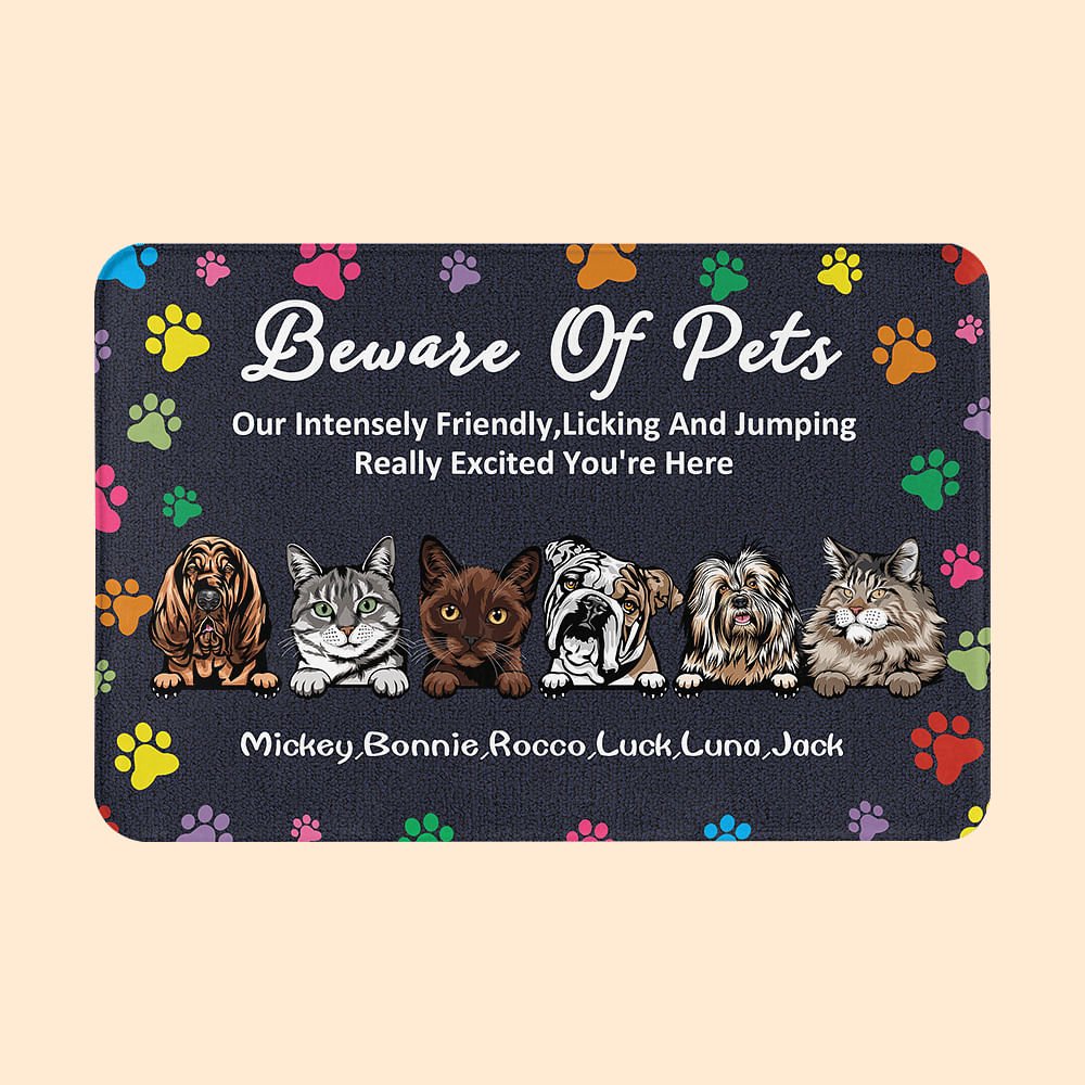 We printed "Beware of Pet/Pets Our/My Intensely Friendly, Licking And Jumping Really Excited You're Here" on the doormat. The fun and witty message adds interest to the doormat and expresses pet owners' love for their furry friends.