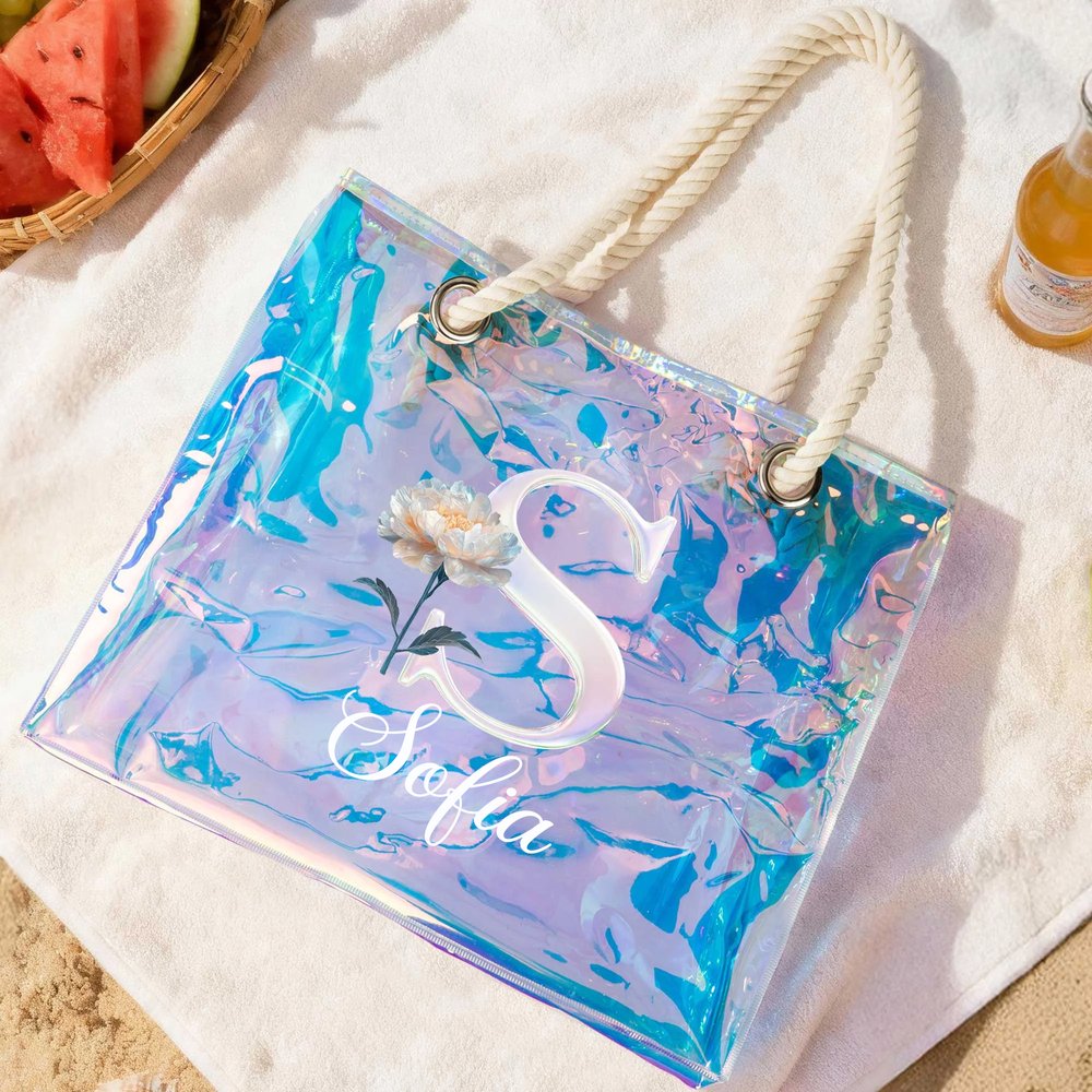 Denna holografiska strandväska förenar modern estetik med tidlös botanisk skönhet. Det unika skiktet bryter ljuset i regnbågens alla färger och skapar en iögonfallande effekt vid varje rörelse. Gör väskan personlig med ett namn, en initial och en vacker månadsblomma - den perfekta detaljen som lyfter din stil på sommarens alla äventyr.