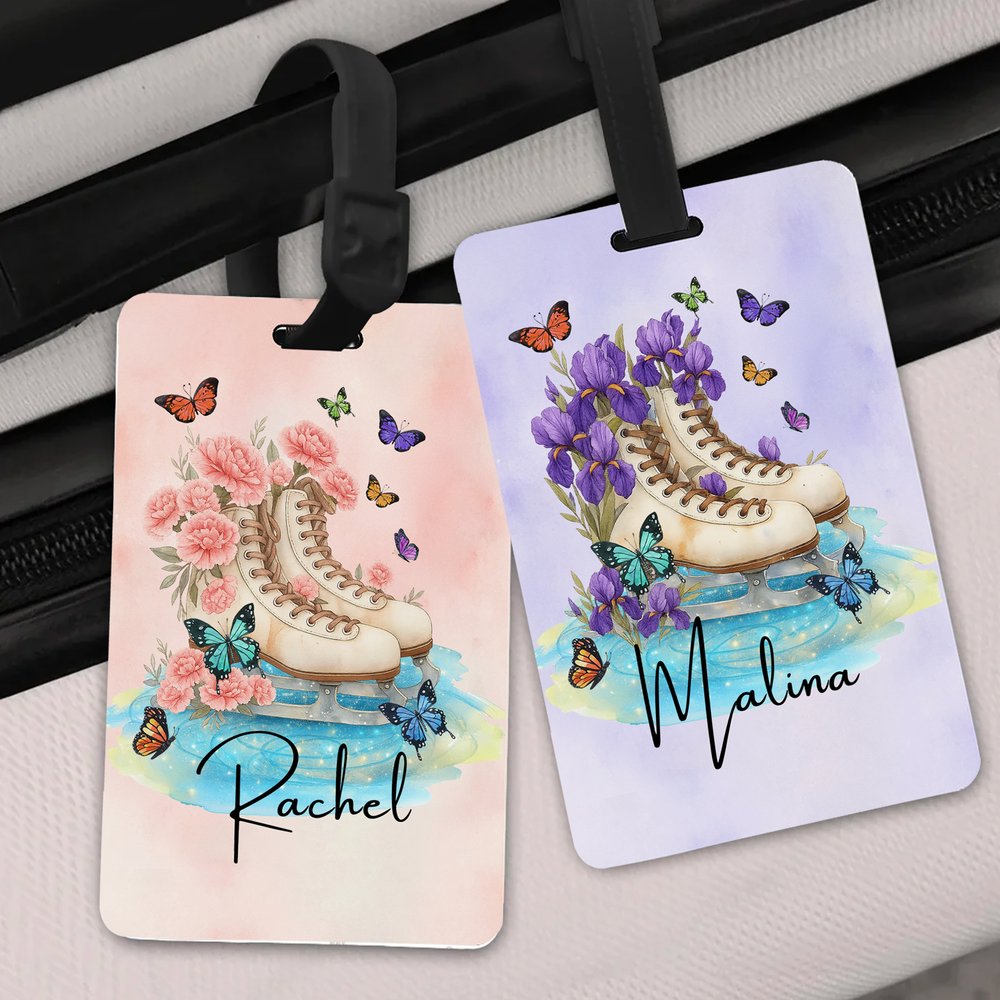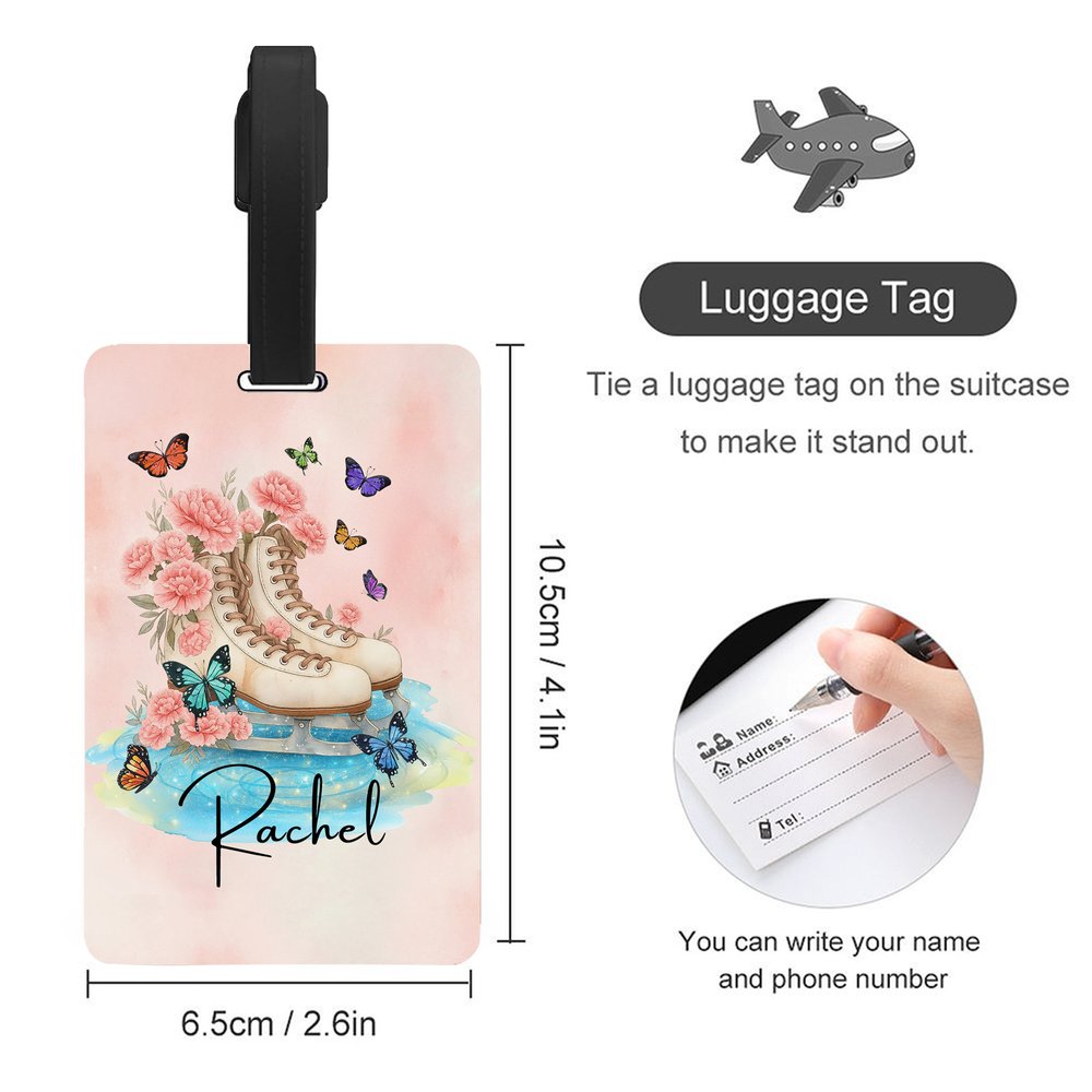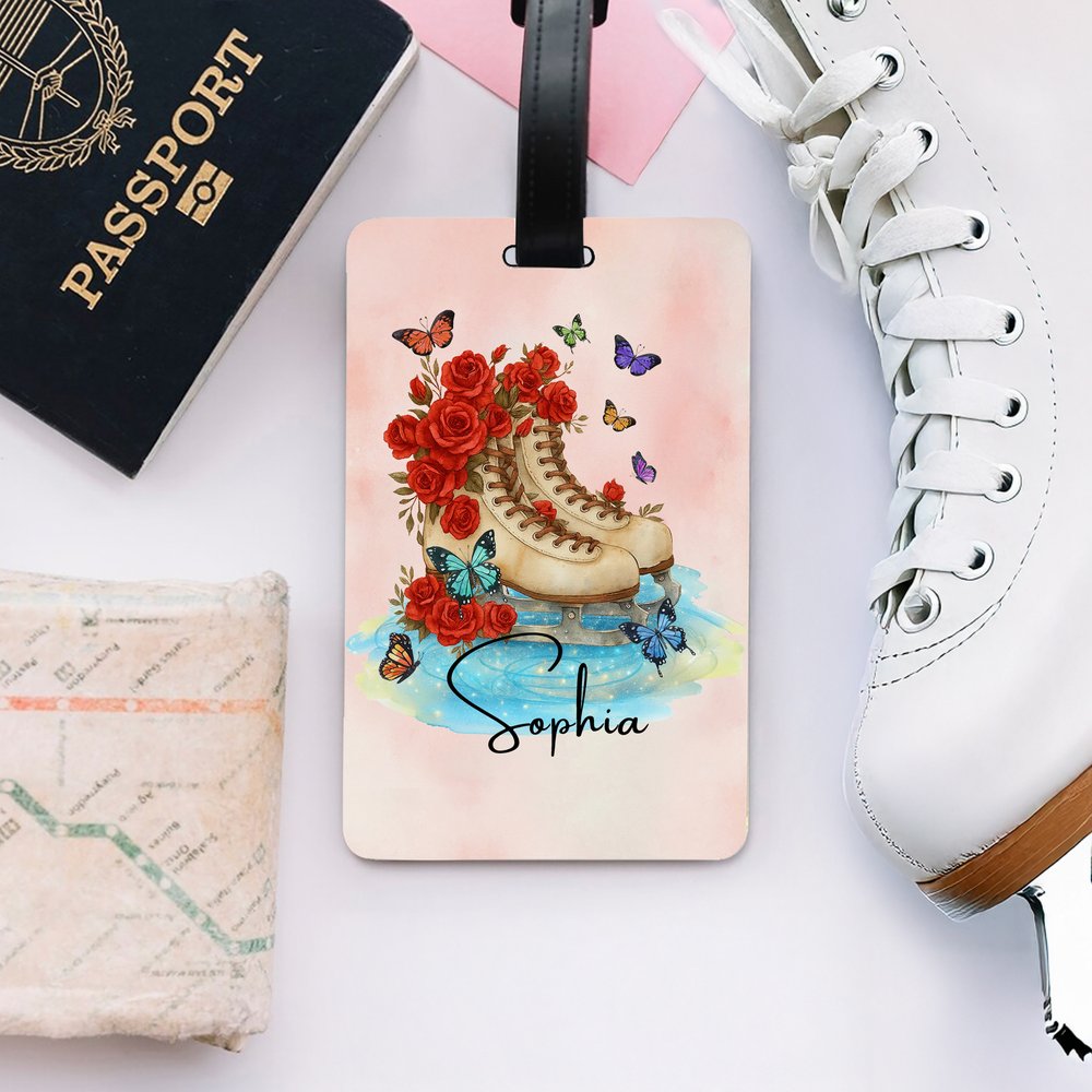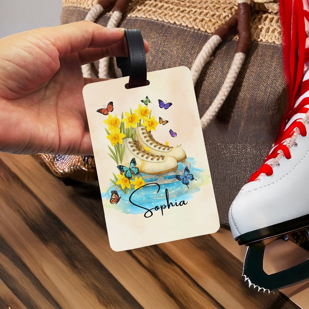 Bagagetaggen har färgglada blommor i akvarellstil, matchade med utsökta isskridskomönster. Helhetsbilden är fräsch och full av konstnärlig känsla. Du kan välja den födelseblomma som motsvarar januari till december och fylla i ett personligt namn för att skapa en unik bagagetagg som visar din kärlek till skridskoåkning.
