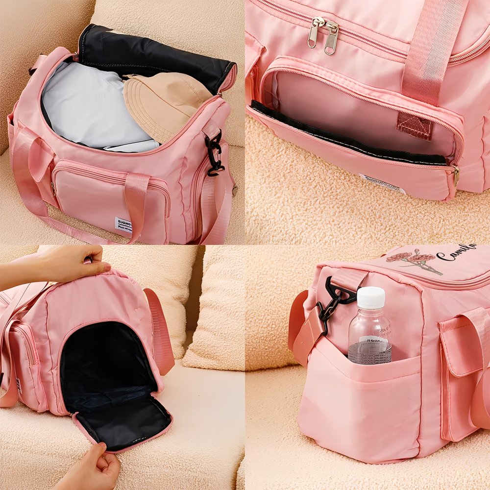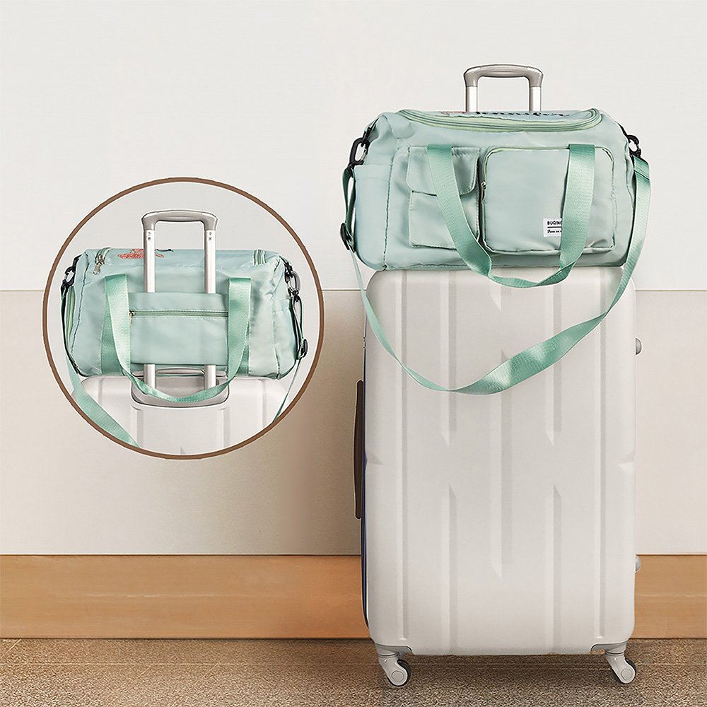 Denna väska har stor kapacitet med flera fack för att rymma mycket av det viktigaste. Den rymliga insidan har ett blixtlåsförsett fack, medan de fyra ytterfacken bekvämt rymmer vattenflaskor, småsaker, skor och andra viktiga saker. Väskan har också en justerbar axelrem och en sleeve för bagagevagnar som enkelt kan bäras och fästas på resväskans handtag för att göra resan problemfri.