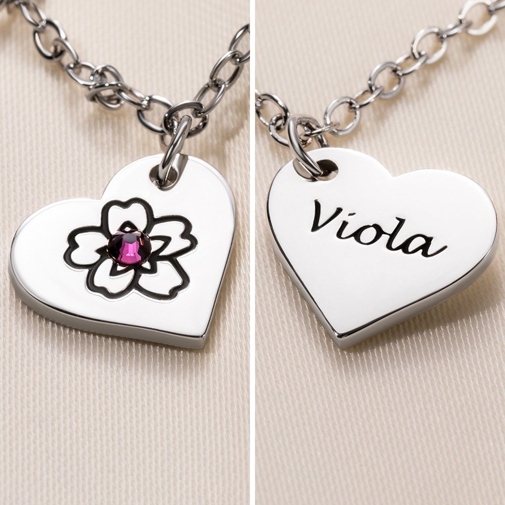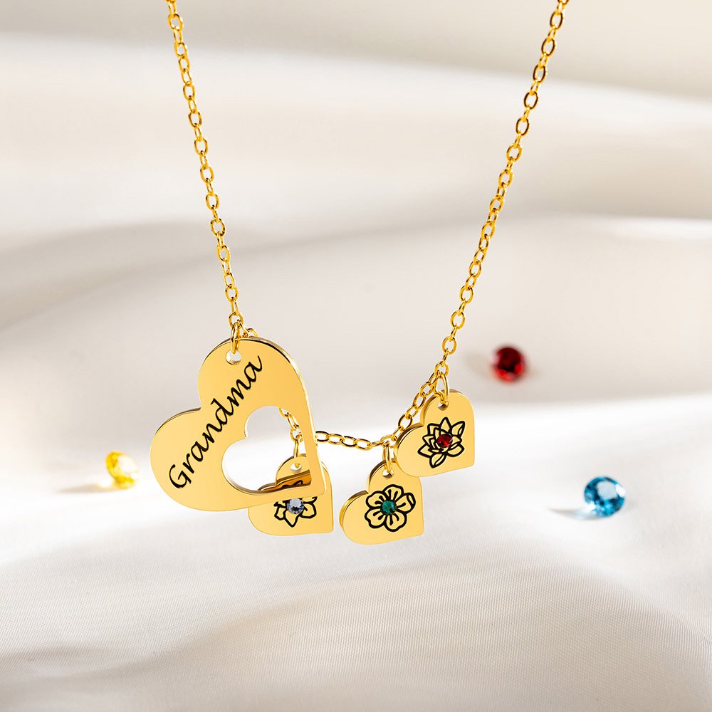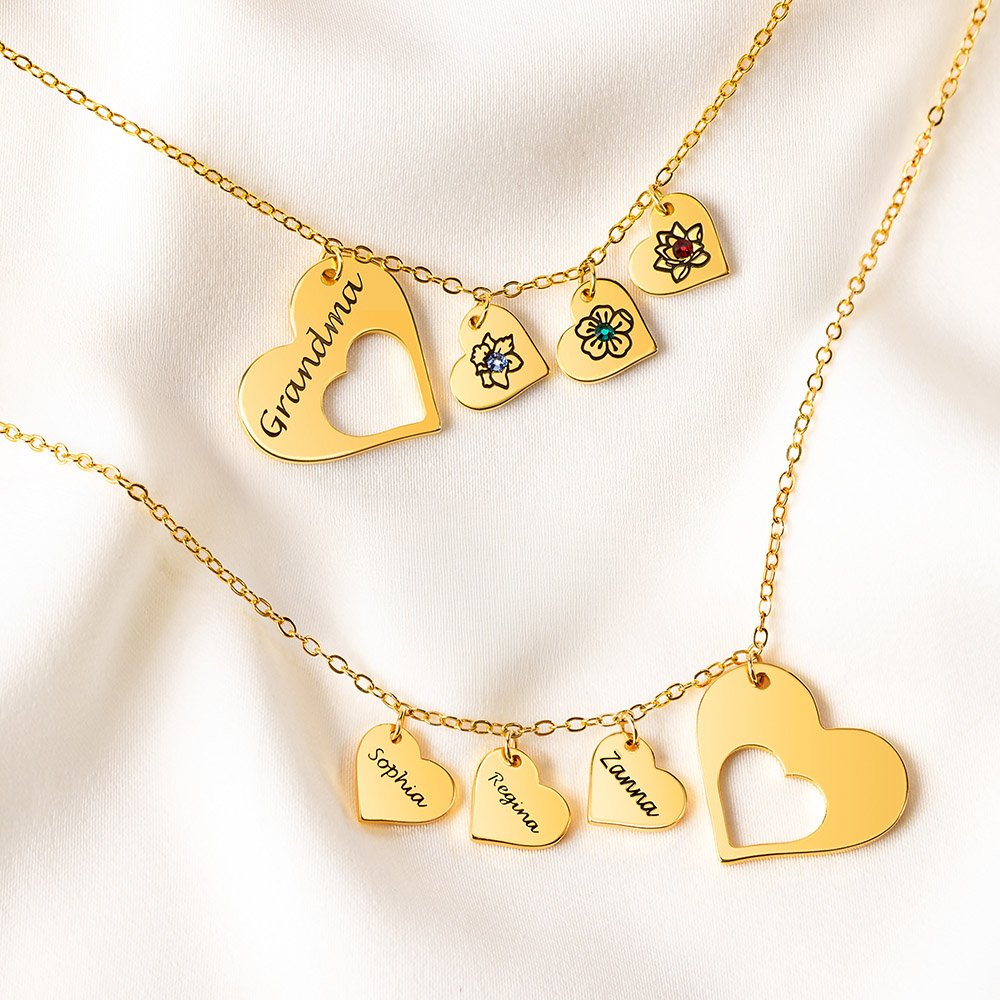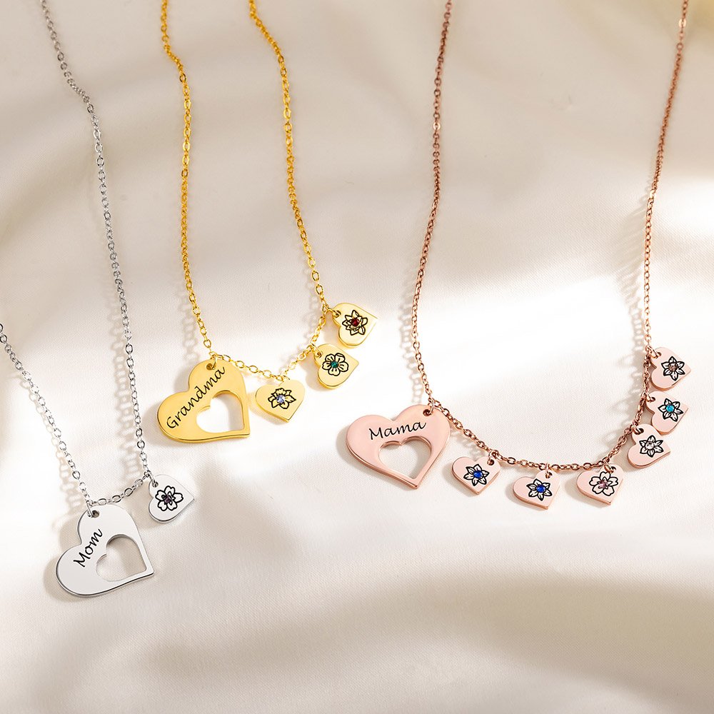 Detta halsband kombinerar på ett smart sätt elementen från födelsedagsblommor och födelsestenar, vilket symboliserar varje familjemedlems unika existens och djupa känslor. Ett stort ihåligt hjärta kan matchas med 1 till 8 små hjärtan. Framsidan av det stora hjärtat kan graveras med den äldres smeknamn, och baksidan av varje litet hjärta graveras med barnets namn. Det betyder att man kan linda familjens kärlek tätt runt halsen och bli den mest värdefulla väktaren i bärarens hjärta.