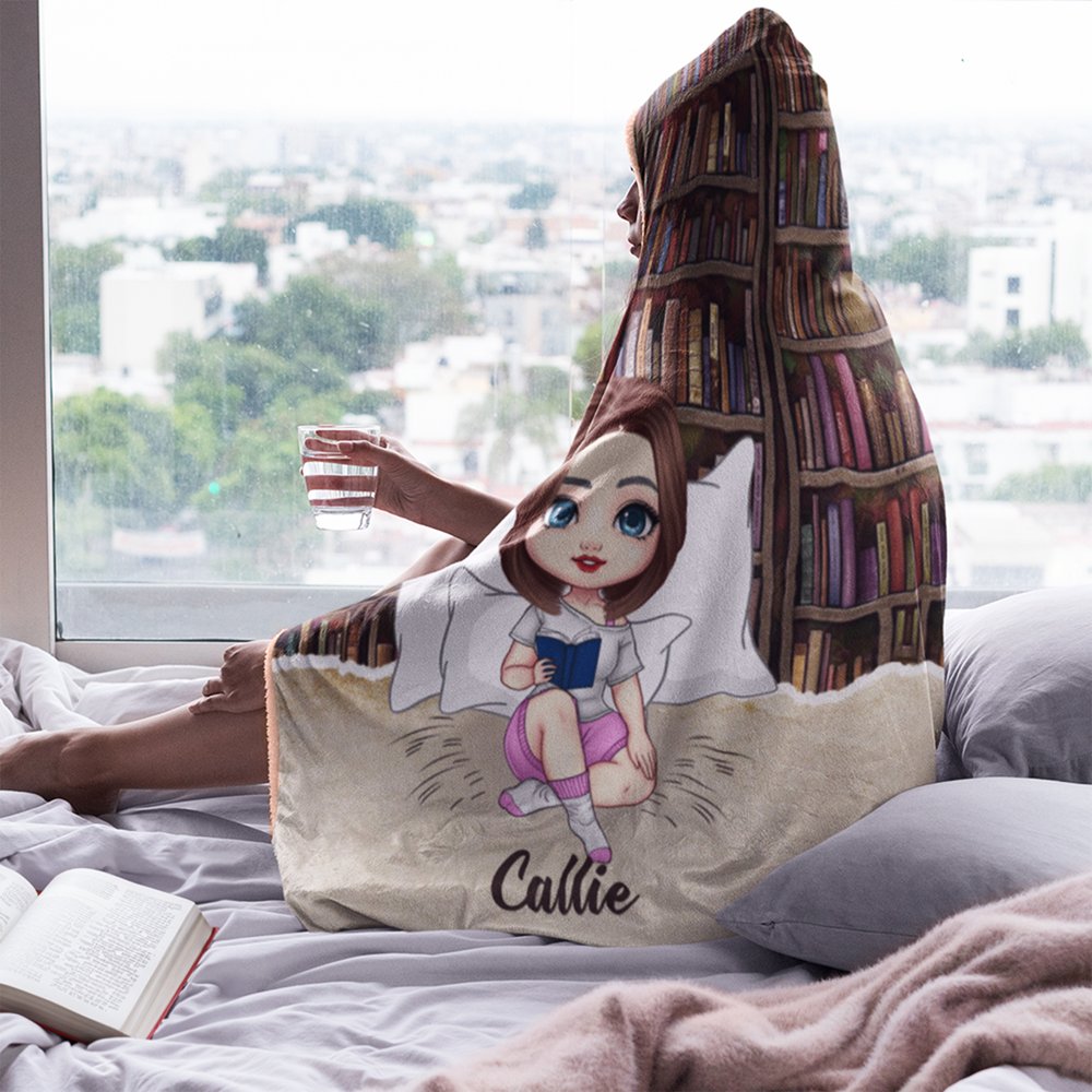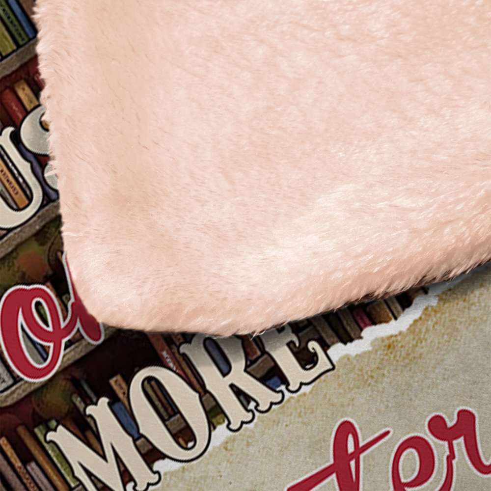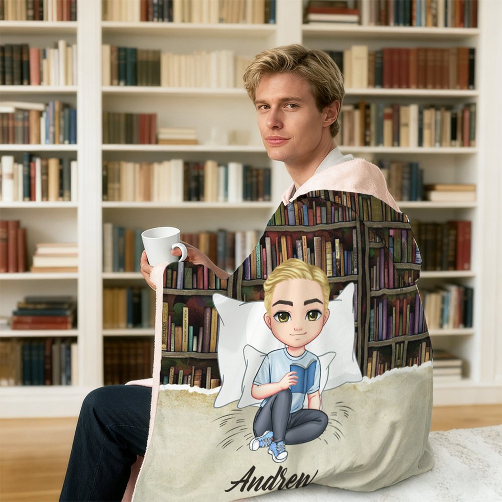 Den detaljerade seriefiguren i kombination med bokhyllans bakgrund och slogan med boktema skapar en nyckfull, litterär atmosfär. Du kan lägga till ett eget namn. Den övergripande stilen är mysig, lekfull och skräddarsydd för läsare, vilket gör den till både en funktionell varm filt och ett charmigt uttryck för ens kärlek till böcker.
