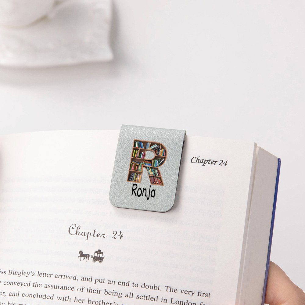 Detta bokmärke har en unik initialdesign där bokstaven är formad som en bokhylla. Det personliga namnet ger en extra personlig touch samtidigt som den litterära tematiken tilltalar bokälskare.
