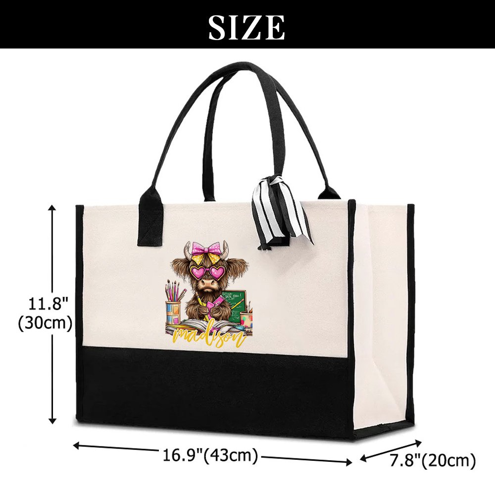 Denna tygväska kombinerar på ett smart sätt det söta Highland Cow-mönstret med element med inlärningstema, som är både intressanta och kulturella. Den utsökta målningsstilen gör den övergripande designen mer varm. Den stöder personalisering och kan lägga till namn för att göra det till ett unikt och exklusivt föremål.