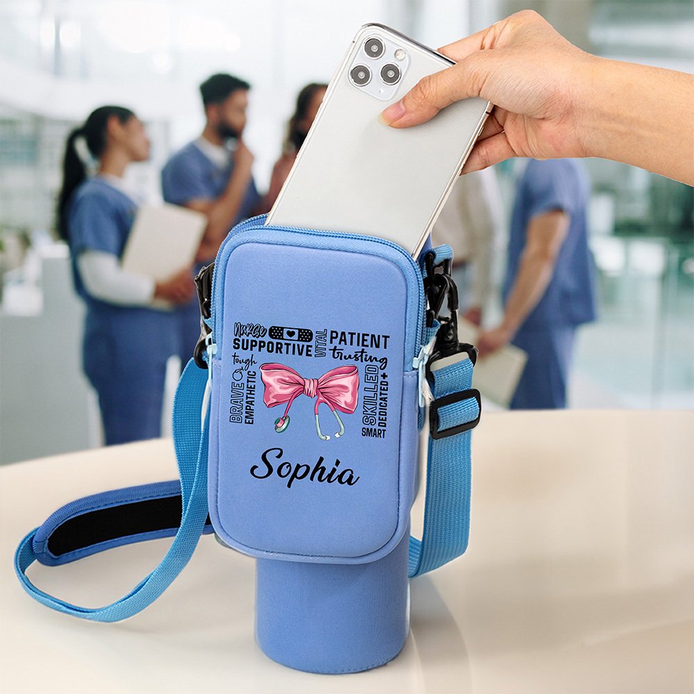 Denna väska finns i fyra färger: aprikos, rosa, svart och blå. Kombinationen av elegans och praktiska egenskaper gör den till en perfekt accessoar för medicinsk personal. Skräddarsy väskan med deras namn för att uttrycka ditt hjärtliga tack och beundran för deras bidrag.