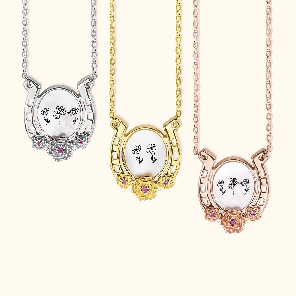 This personalized necklace is a perfect gift. The horseshoe pendant, resembling a crescent moon, symbolizes eternal youth and strength in ancient Greek mythology, while the delicate flower represents the birth month of your loved one. The unique blend of these two symbols makes it an ideal gift for your mother or grandmother.