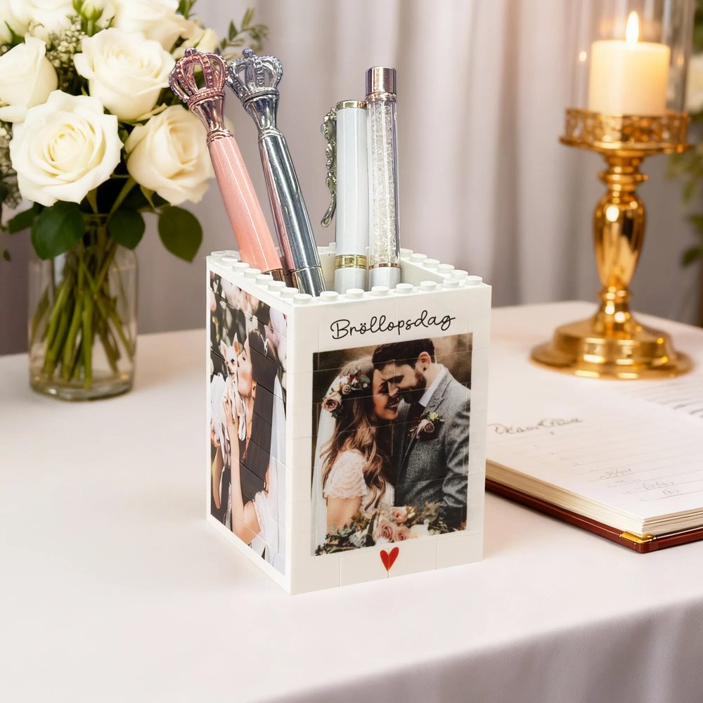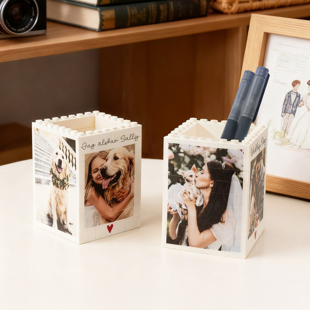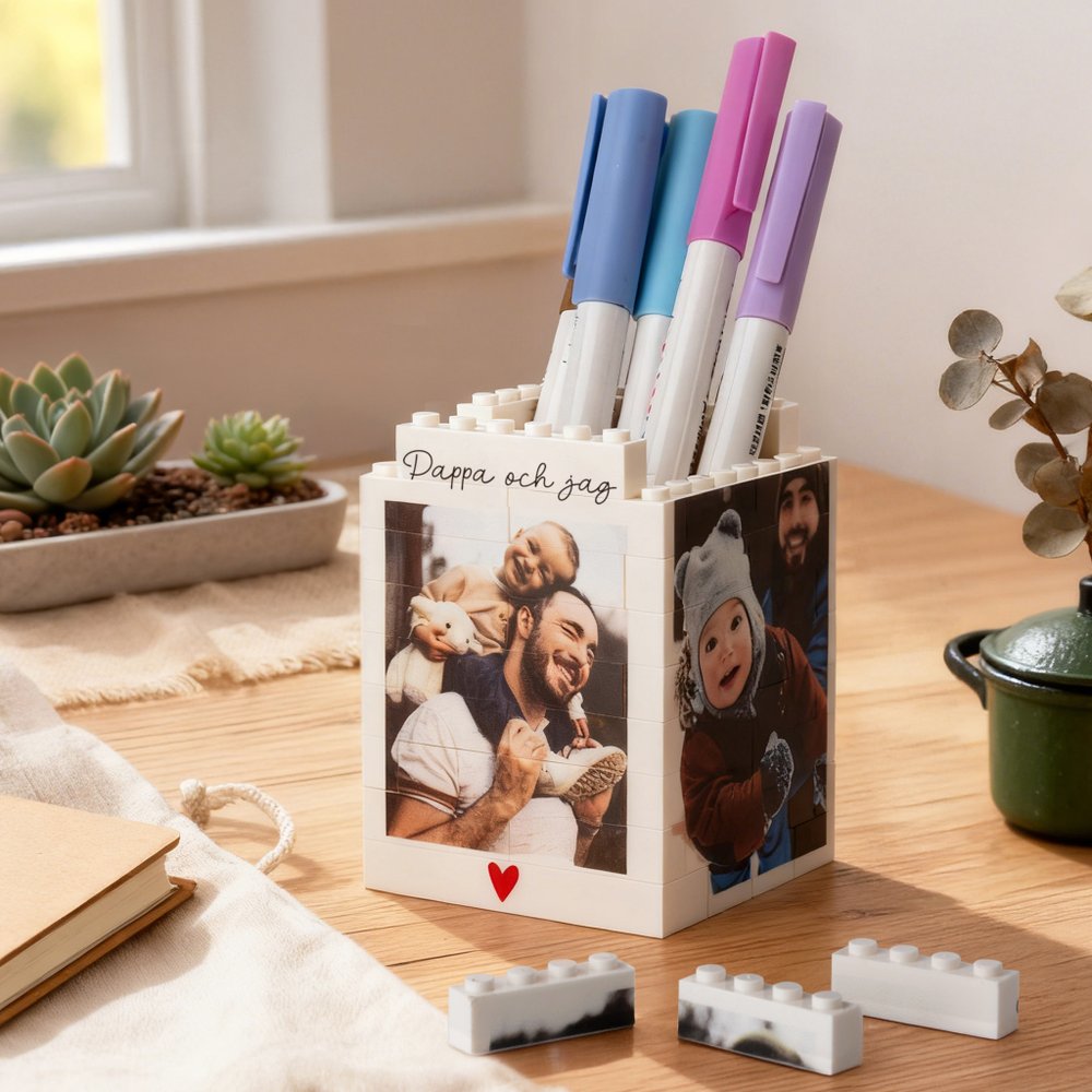 Denna pennhållare har en byggklossdesign som kan anpassas med upp till 4 bilder och texter på alla sidor. En familjefoto eller ett särskilt meddelande blir en del av designen, vilket gör den till en unik present som berättar historien om er familjs band.