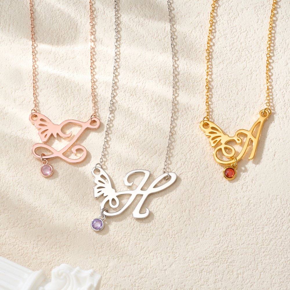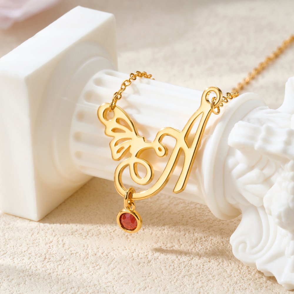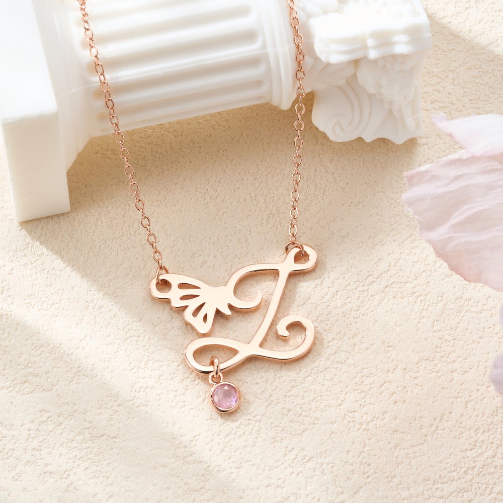 Detta utsökta smycke blandar elegans med personlig betydelse. Den skira fjärilsinitialen symboliserar förvandling och skönhet, och födelsestenen ger en unik touch som gör att bäraren kan vårda sin identitet och sina värdefulla minnen.