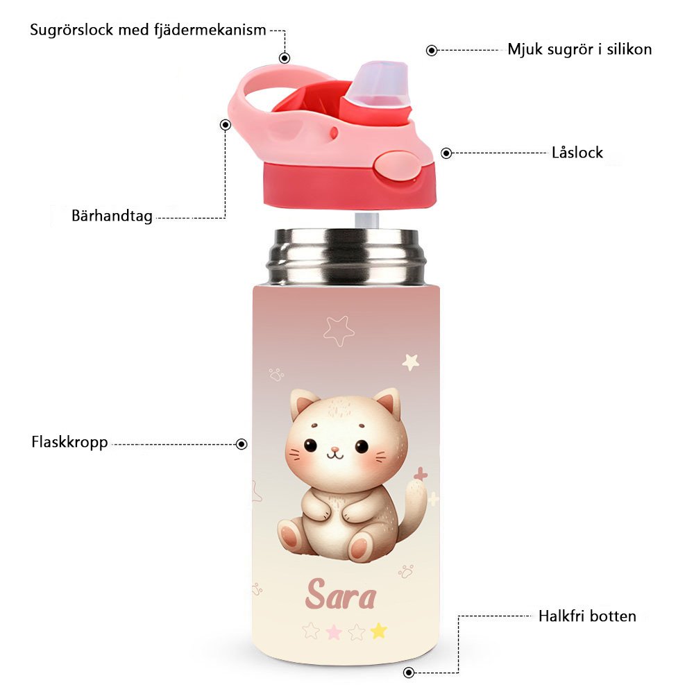 Denna vattenflaska har 61 söta tecknade djur, inklusive björnar, kattungar och lejon, kombinerat med stjärnelement för att skapa en livlig och lekfull atmosfär. Med 7 bakgrundsfärger, inklusive rosa, blå, grön och gul, kan barnen välja sitt favoritdjur och lägga till sitt namn, vilket skapar en personlig flaska som gör varje klunk rolig och speciell.