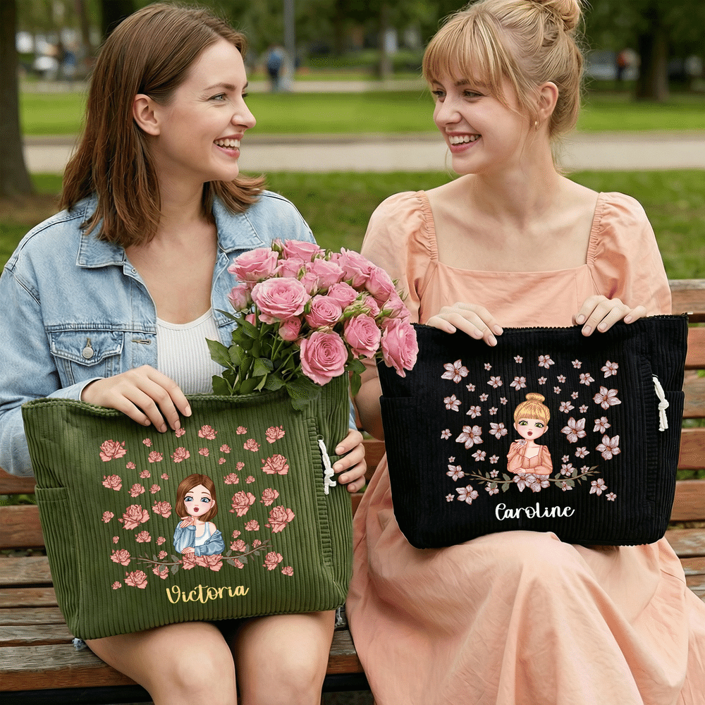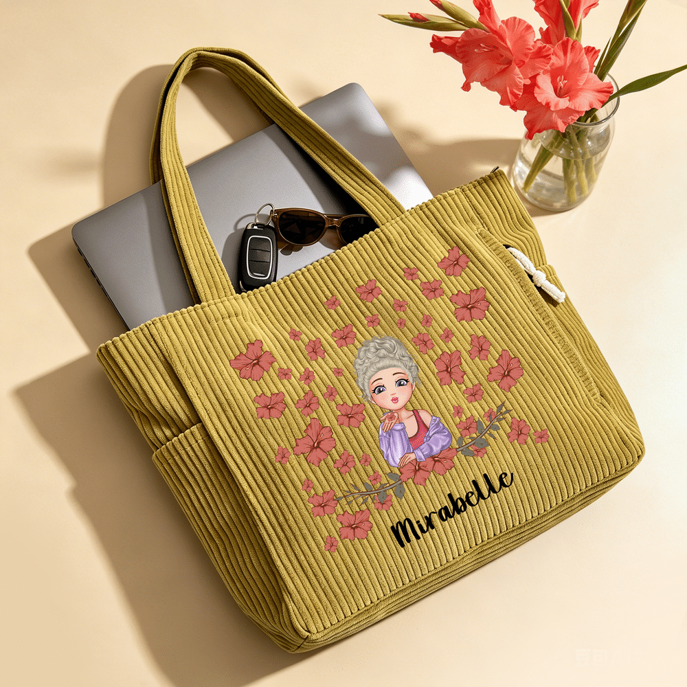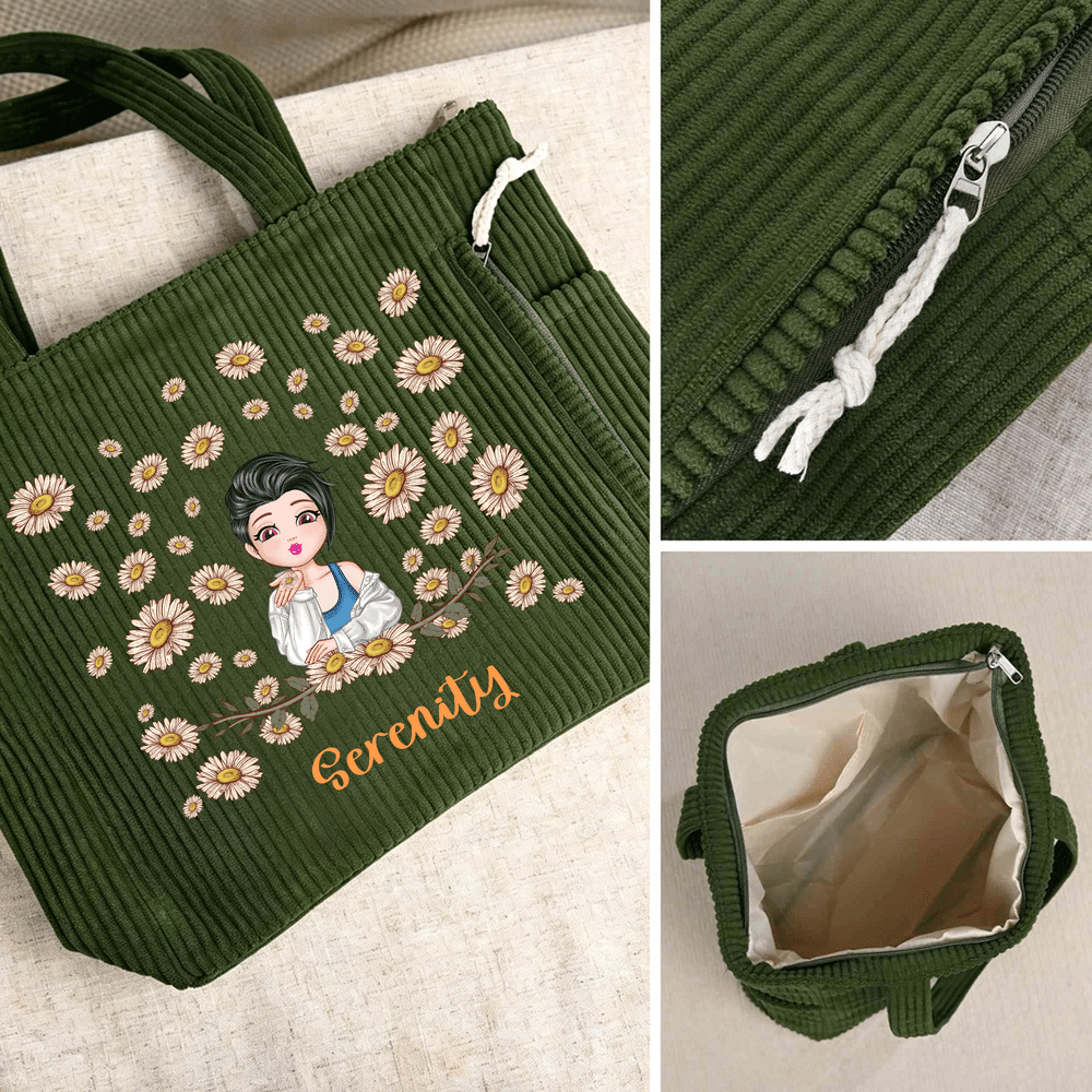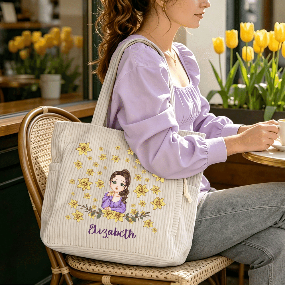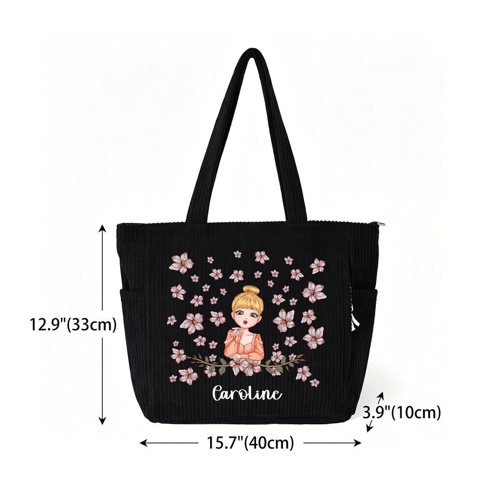 Personlig tecknad karaktär stor kapacitet Corduroy Tote Bag med födelseblomma och namn Resa väsentlig födelsedagspresent för kvinnor
