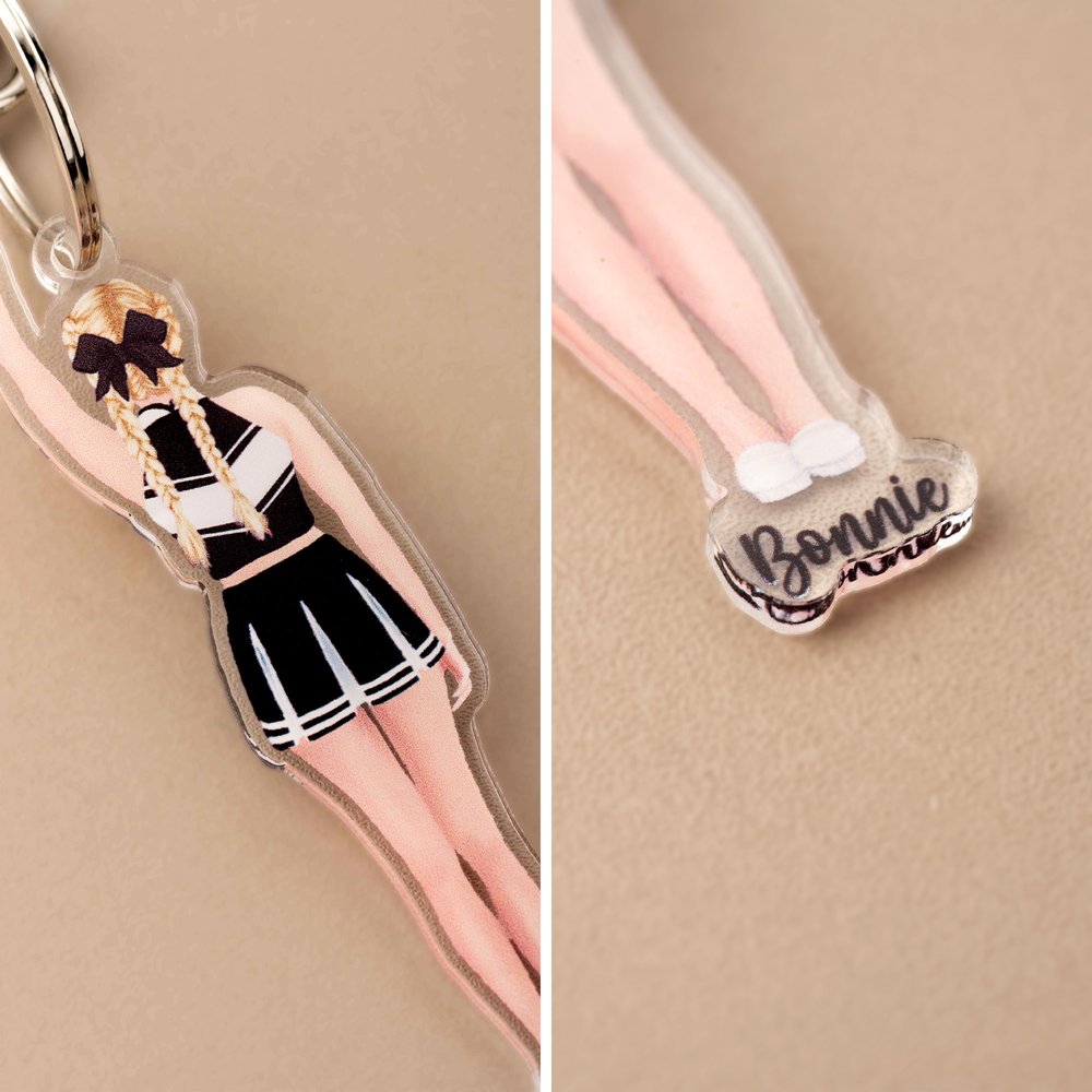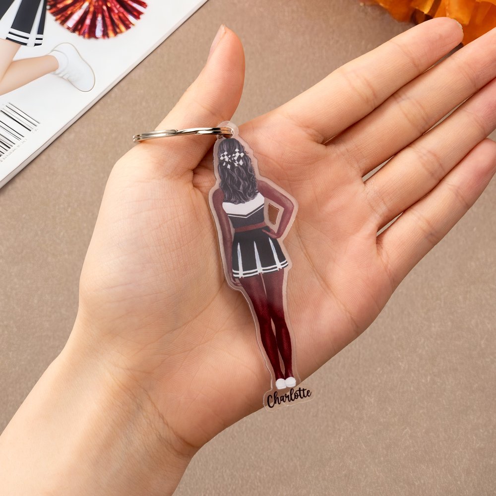 Nyckelringen är tillverkad av högkvalitativt akrylmaterial och är utformad för att motstå slitage och stötar, vilket garanterar hållbarhet och lång livslängd för cheerleaders. Metallspännet är robust och säkert, vilket minimerar risken för att det lossnar eller lossnar. Alla kanter är mjukt polerade för en delikat känsla. Oavsett om det är för daglig användning eller som samlarobjekt bibehåller det sin skönhet och kvalitet och ger cheerleaders en varaktig accessoar.