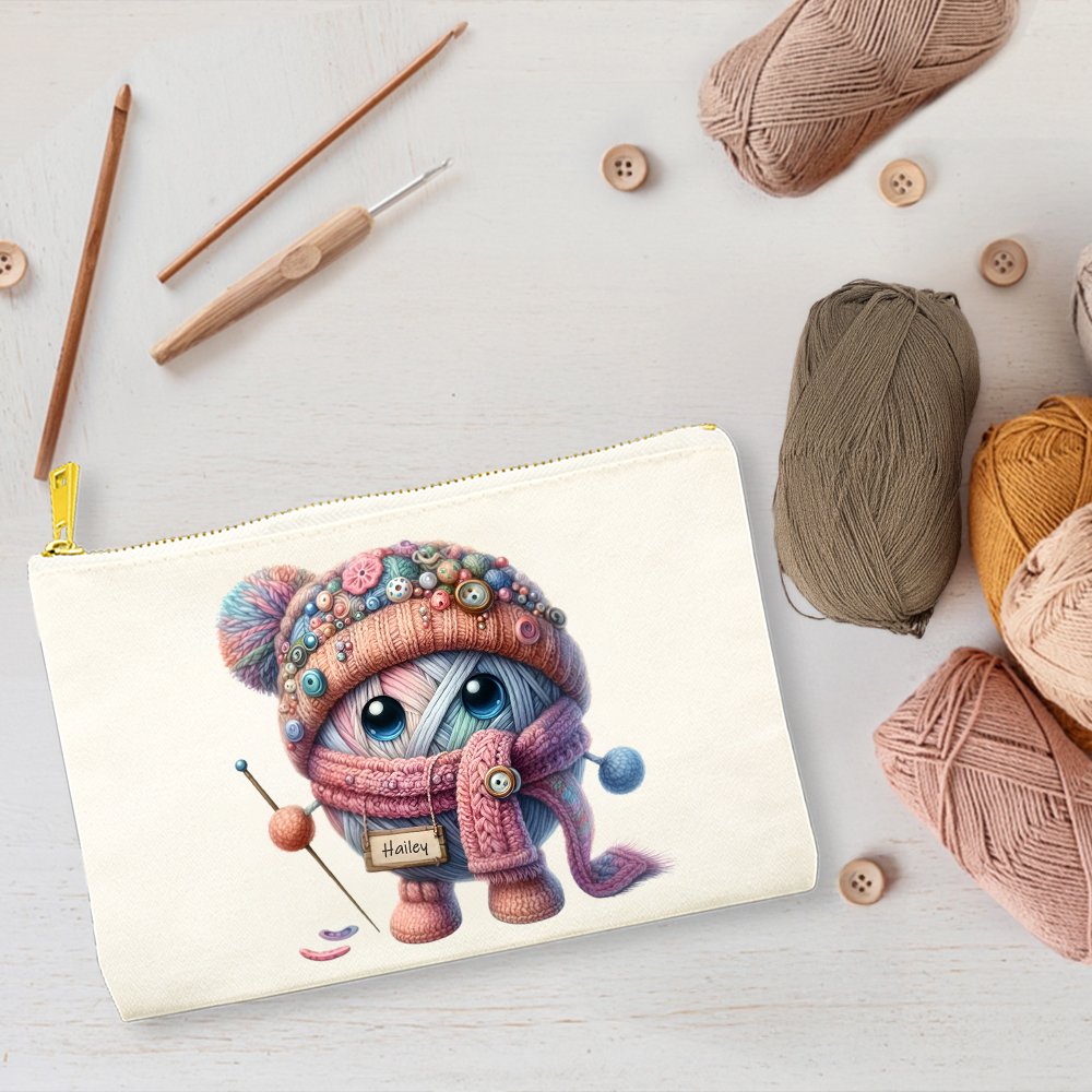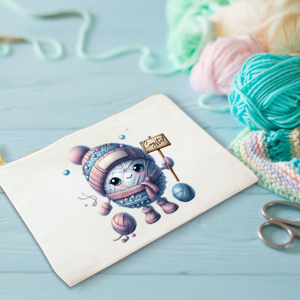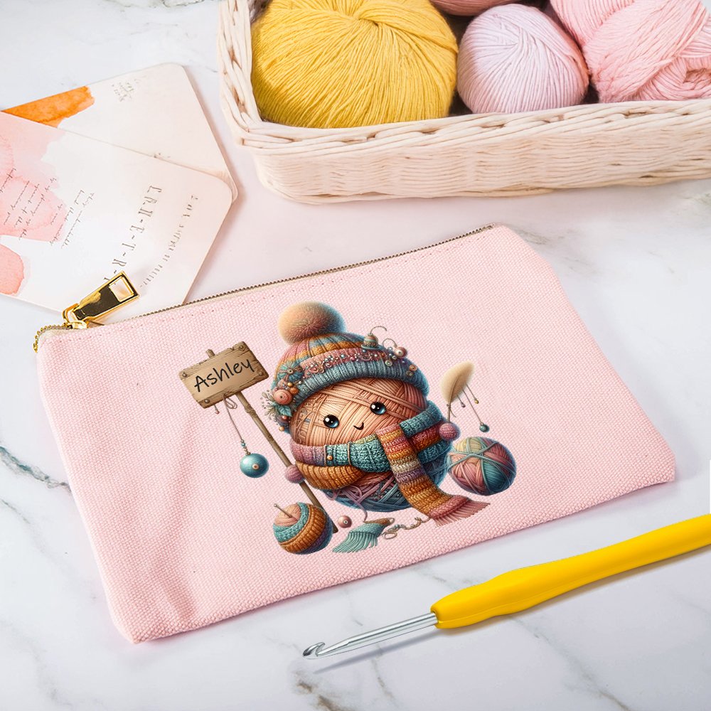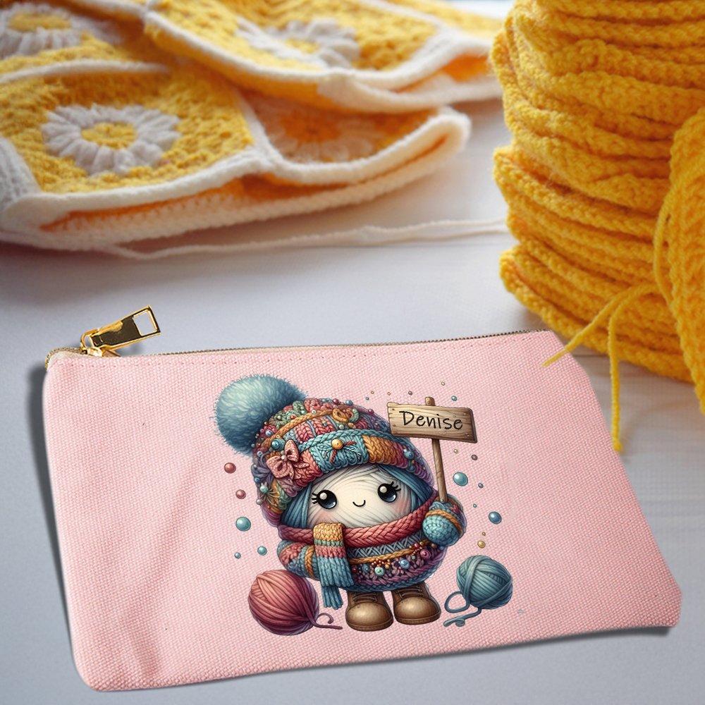 Designen på denna sminkväska är baserad på temat tecknad virkning. Den kombinerar på ett smart sätt virkade element med tecknade mönster för att skapa en konstnärlig och personlig stil. Väskan kan också anpassas med ett namn för att lägga till en speciell identitet.