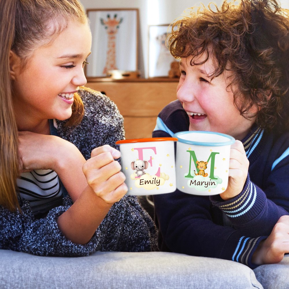 De här personliga emaljmuggarna har en unik och festlig design. Tecknade figurer är levande och färgglada. Varje mugg har 43 olika djurmönster och kan förses med initialer och namn, vilket gör dem mycket personliga.