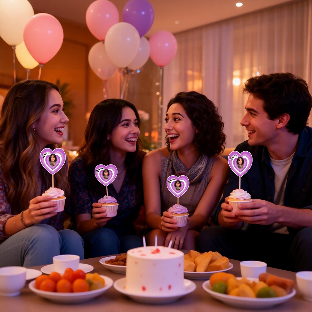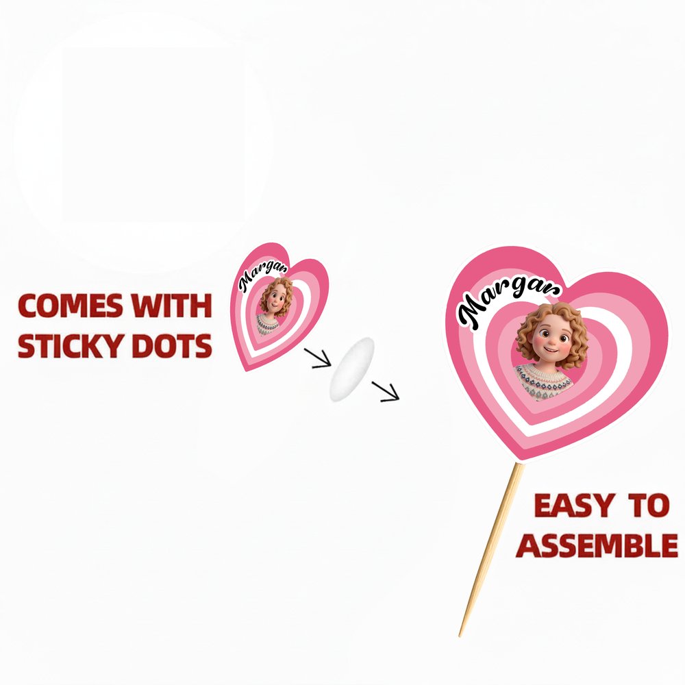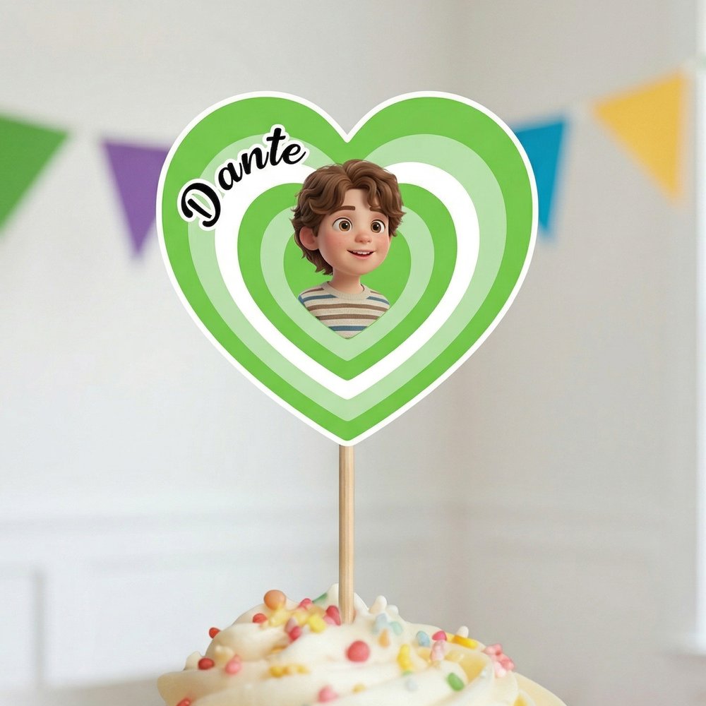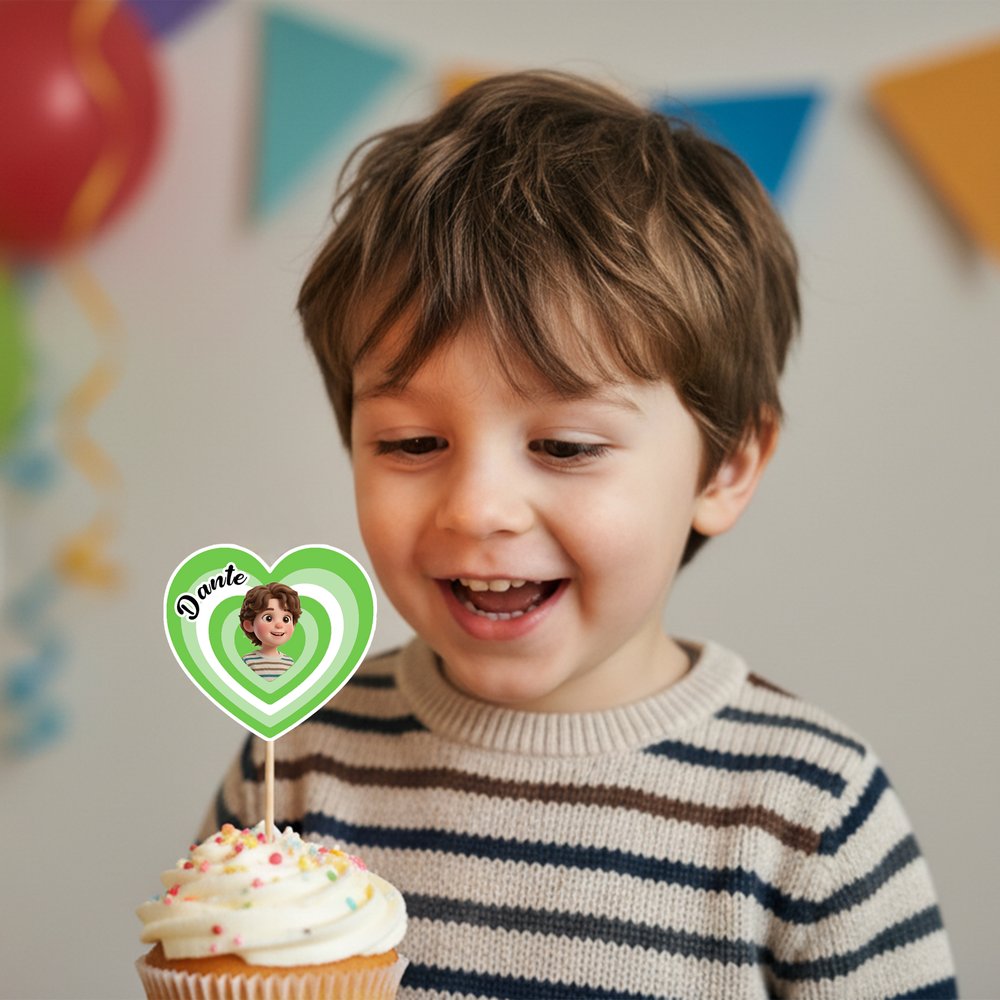 Denna cupcake-topper har en kreativ kombination av hjärtan med gradient i flera lager och ett personligt foto av ett tecknat ansikte. Anpassa den med ett foto och namn för en unik dekoration. Finns i gradientfärger för att matcha olika festteman och stilar, lägga till exklusiv rituell charm till varje cupcake och sticker ut från generisk festdekor.