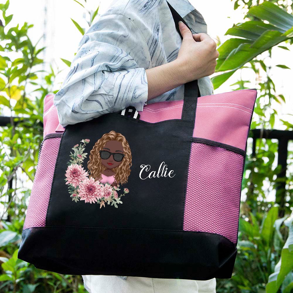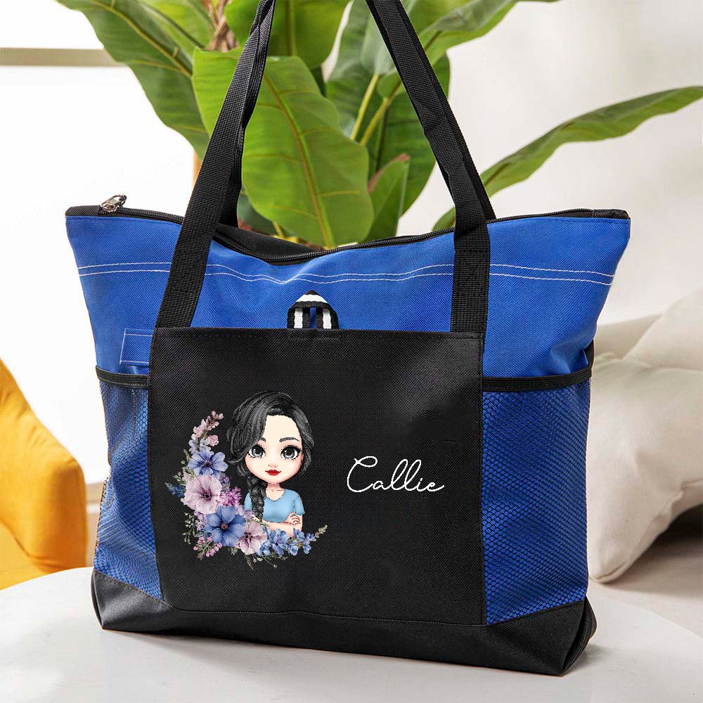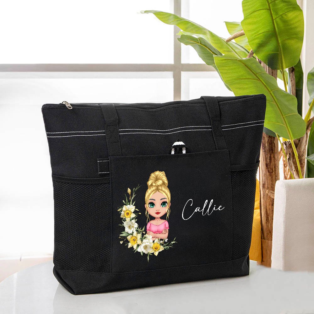 Denna tygväska har en härlig tecknad kvinna eller flicka omgiven av en fjärilsdesign, vilket skapar en unik och personlig look. Den levereras också med födelseblommor och namn, vilket gör den till en unik accessoar.