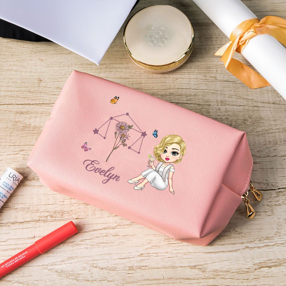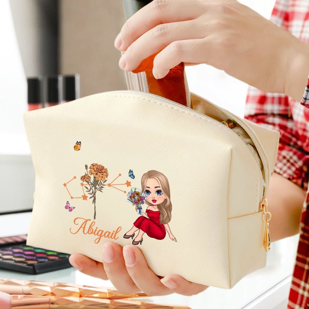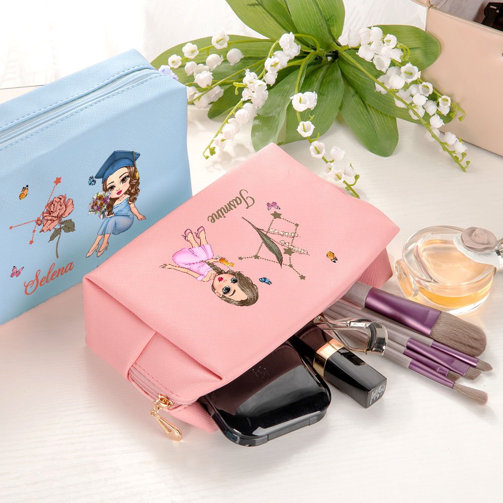 Fira examen med denna personliga kosmetikväska, som innehåller en tecknad akademiker och hennes unika födelseblomma. Välj bland en mängd olika examenskläder, till exempel klassiska mössor och klänningar eller utsökta klänningar, för att uttrycka examenskvinnans smak på rätt sätt.