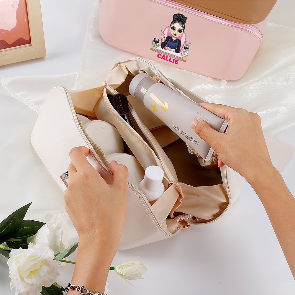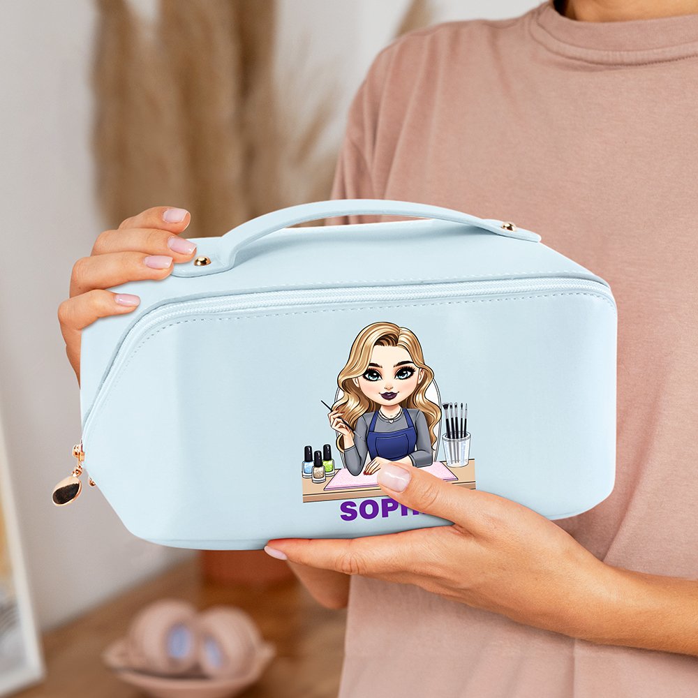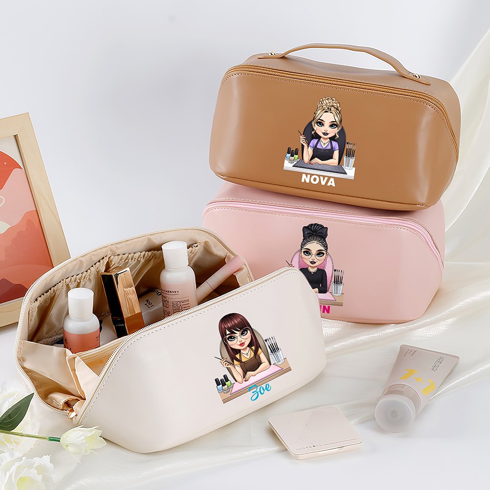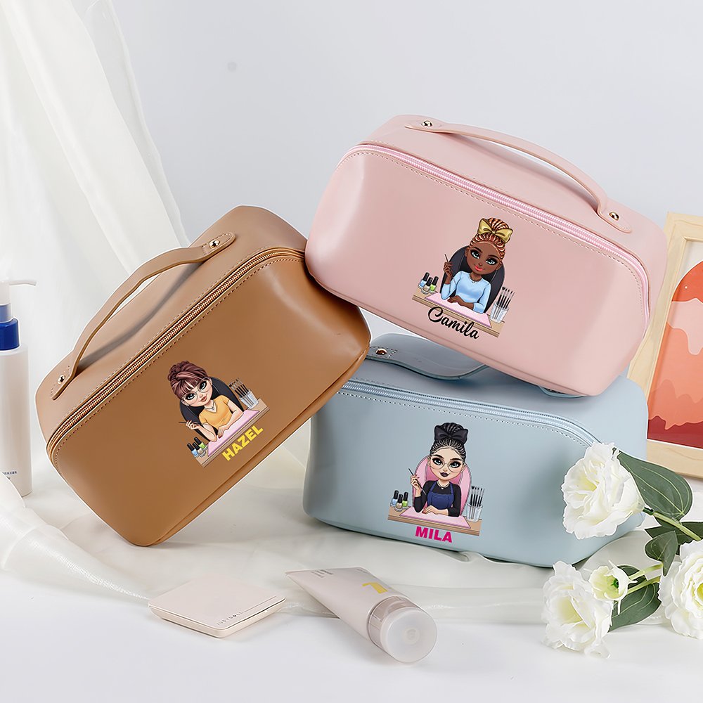 Denna kosmetikväska kombinerar perfekt tecknade kvinnliga karaktärer med temaelementen i en nagelsalong. Du kan anpassa karaktärsbilden enligt din prototyp och välja nagellacksflaskor, borstar och andra nagelverktyg för att skapa en elegant och professionell atmosfär. Vi tillhandahåller 10 namnfärger