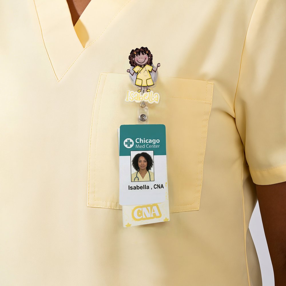 Badge-rullen är tillverkad av slitstark akryl och har ett skarpt, reptåligt tryck som förblir levande även vid daglig användning. Det infällbara klippet glider smidigt och studsar tillbaka pålitligt och motstår slitage från konstant dragning, medan det robusta bakre klippet håller ID-brickor säkert utan att flytta sig. Med balans mellan funktionalitet och stil är den byggd för att hålla jämna steg med hennes mest hektiska skift.