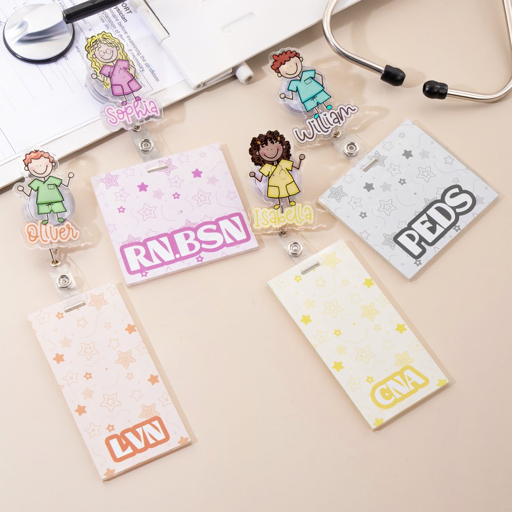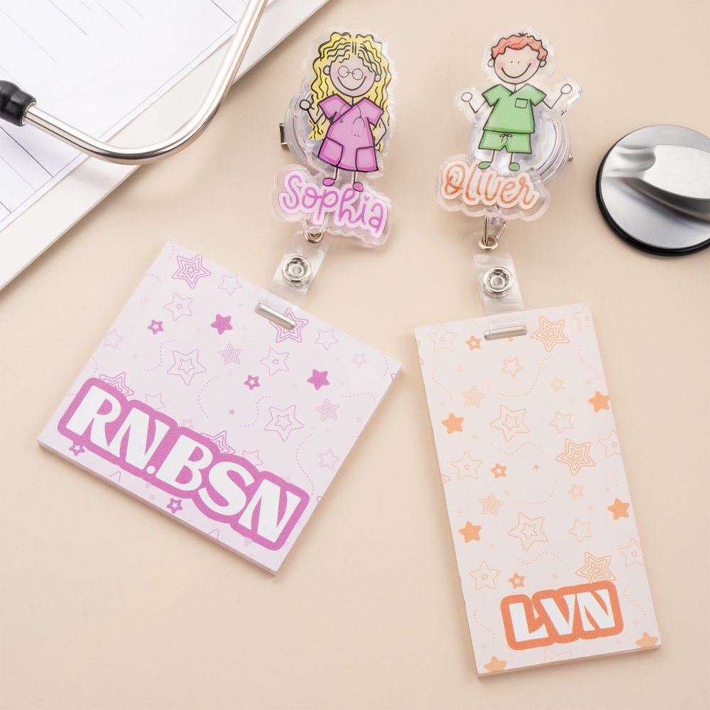 Centrerad på en läkande enkel skisssköterskebild, parar denna badge-rulle en drömmande stjärnbakgrund med anpassat namn och titeltext, som blandar professionell identitet med personlig värme. Den lekfulla karaktärsdesignen och den mjuka färgpaletten utstrålar tillgänglighet och ger omedelbart en touch av charm till medicinska skrubbar - vilket gör varje rulle till en unik professionell minnessak som är gjord just för henne.