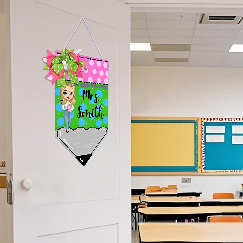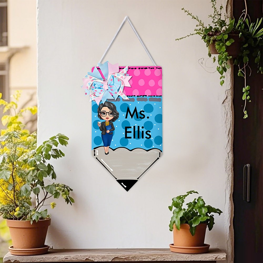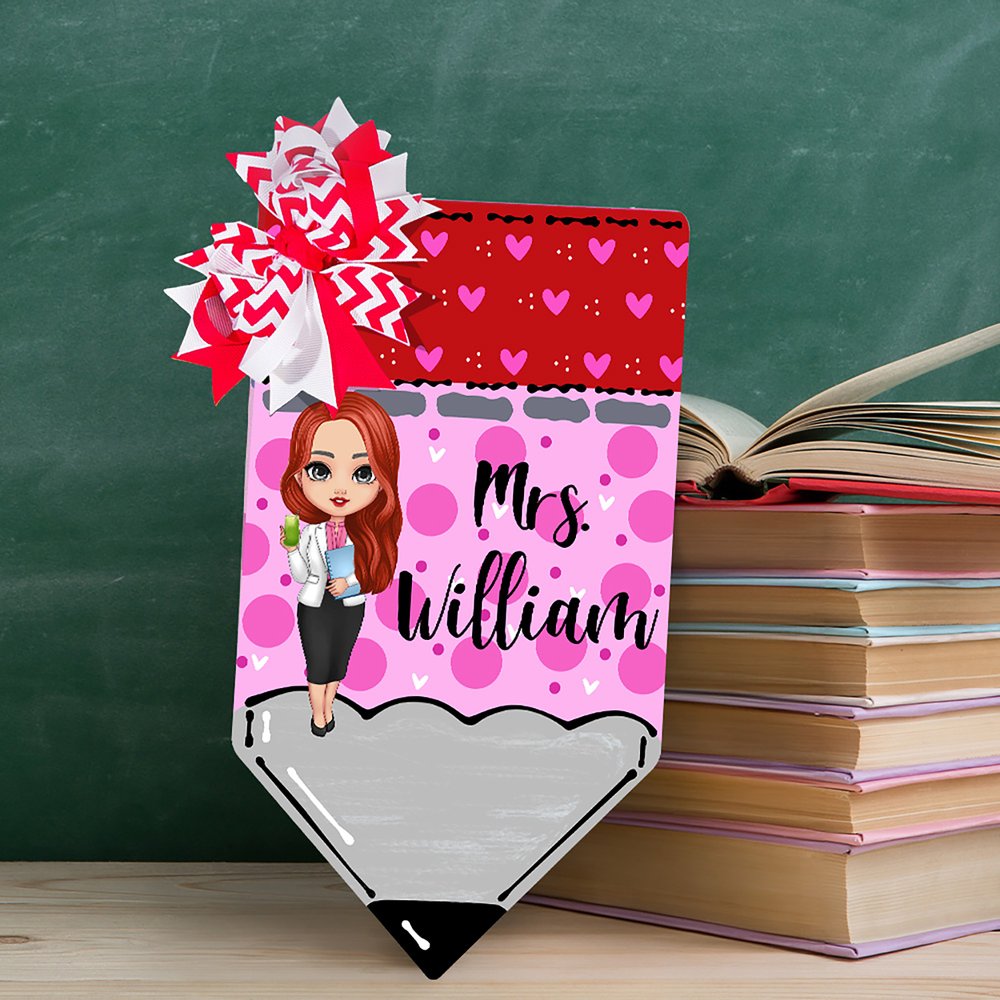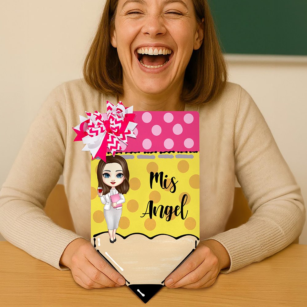Denna skylt är inspirerad av en penna, prydd med hjärtan och prickar, och finns i sex livfulla färger. Den har en tecknad lärarkaraktär baserad på din bild och hyllar lärarnas hängivenhet och hårda arbete. Det anpassade lärarnamnet ger en personlig touch till deras arbetsyta och visar deras känsla av stolthet.