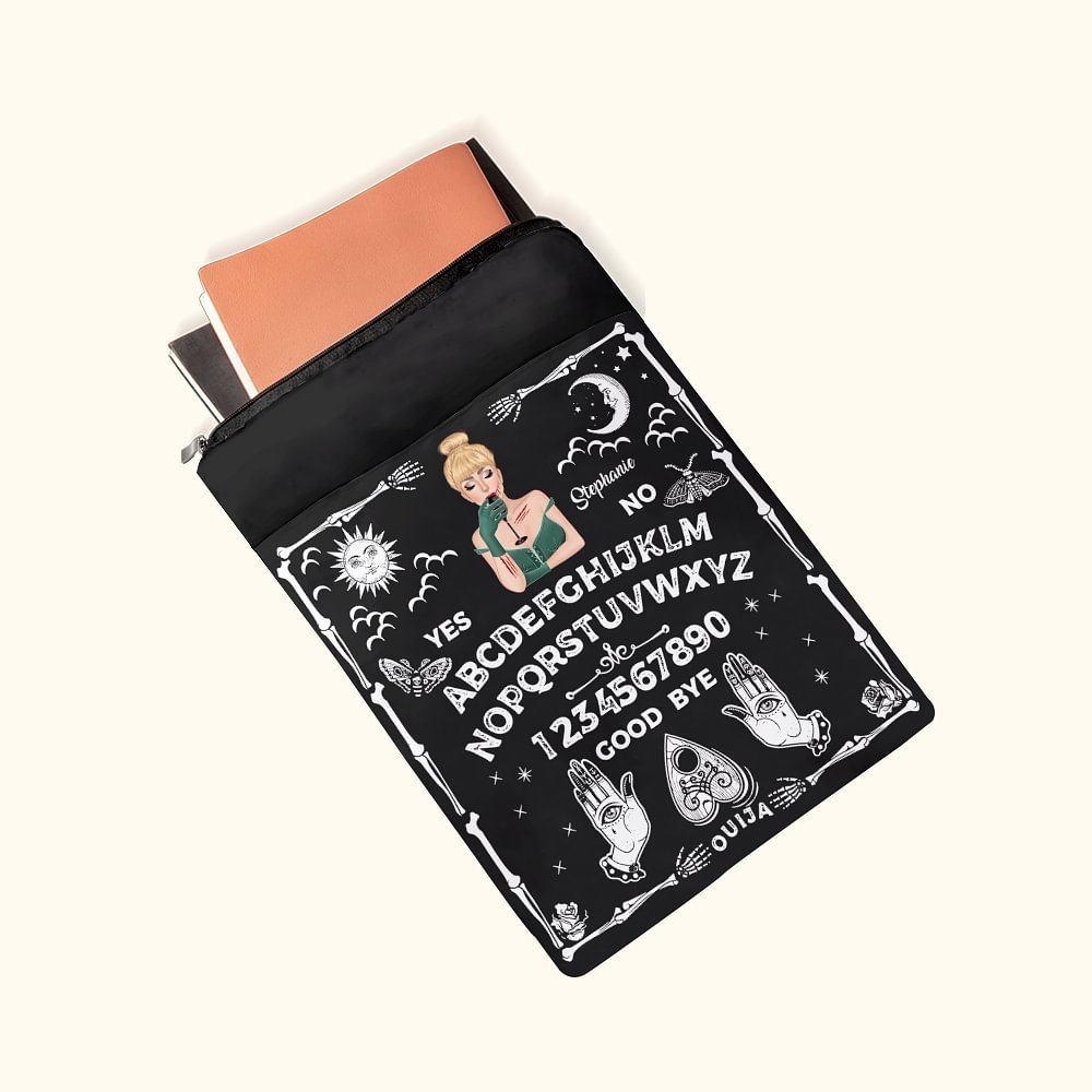 Detta bokomslag har en klassisk Ouija-brädesdesign med detaljerade bokstäver, siffror och ikoniska symboler, tryckt med sol- och måndekorationer, och du kan anpassa vilket namn du vill och en häxbild för att ge en övernaturlig touch till dina Halloween-dekorationer. Den blandar spöklikt och roligt, vilket gör den till en iögonfallande accessoar för Halloween eller vardagslivet.