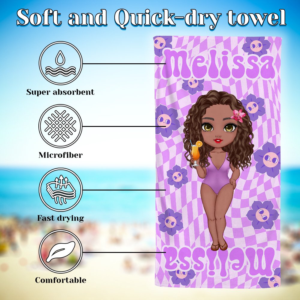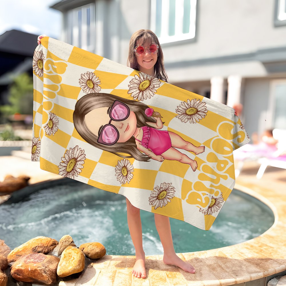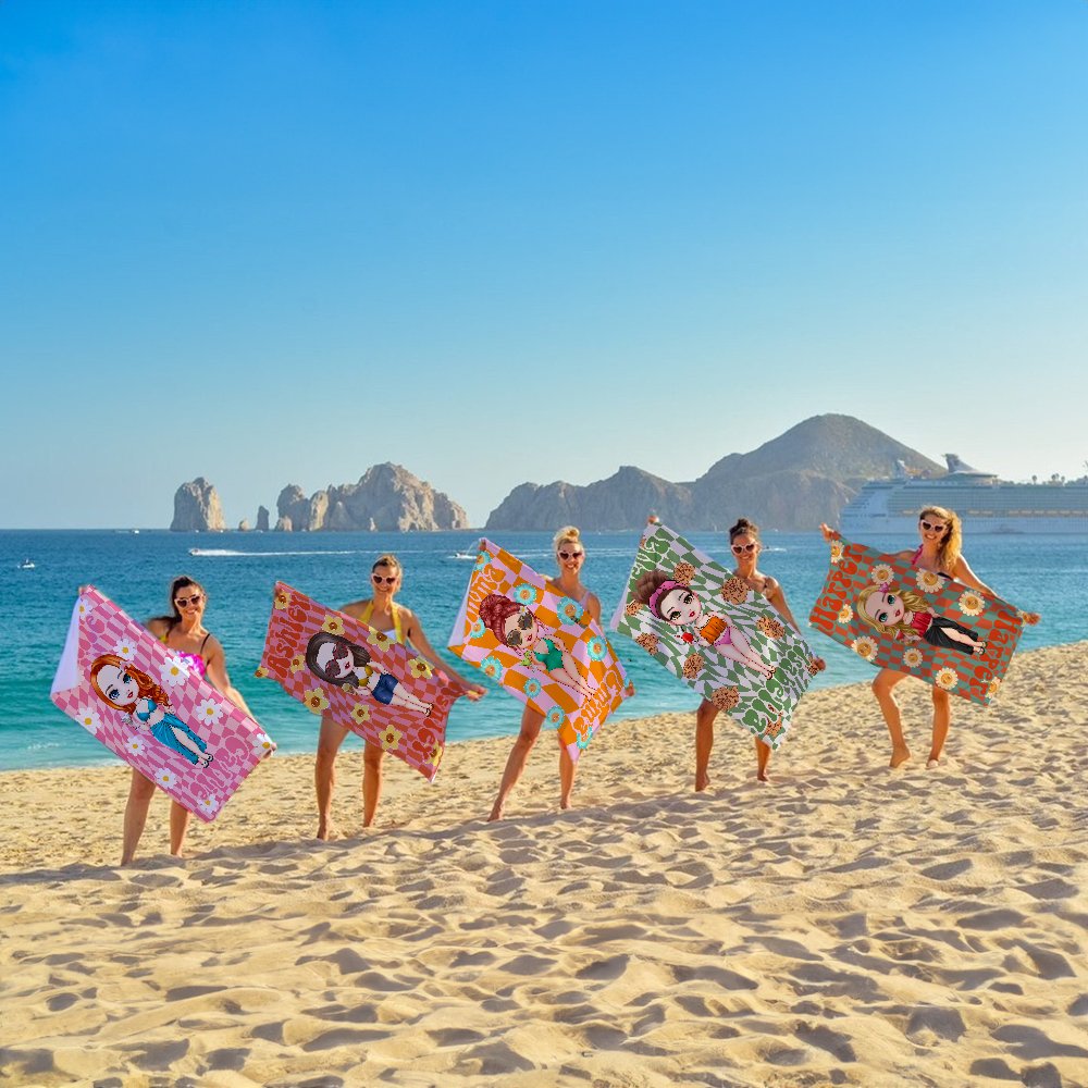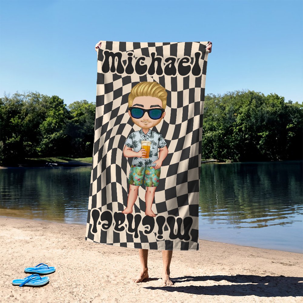 Denna överdimensionerade strandhandduk har ett lekfullt rutmönster med charmiga seriefigurer, vilket gör den till en härlig accessoar för strandfester och sommarsemestrar. Gör den personlig med ett namn för en unik touch som sticker ut.