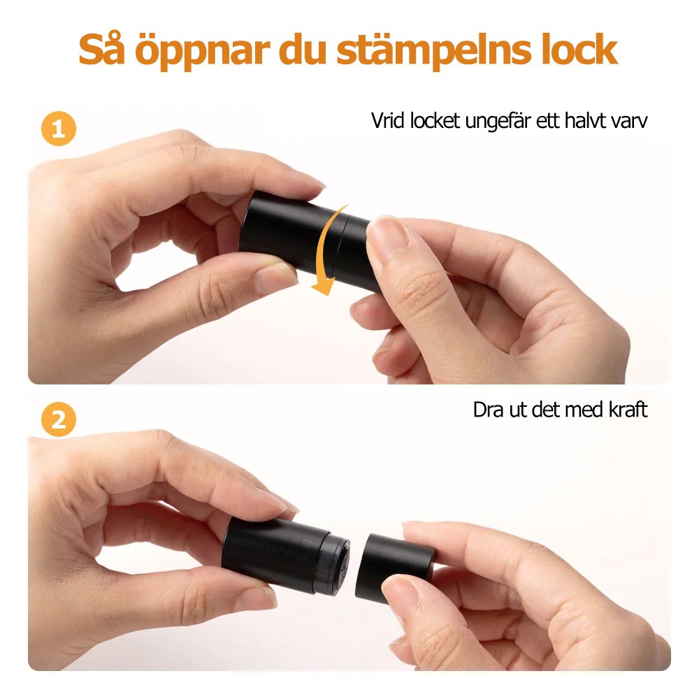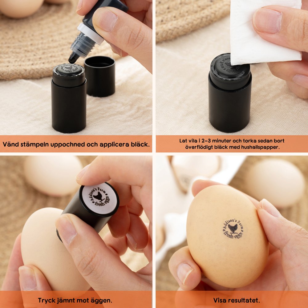 1. När du använder stämpeln de första gångerna kan locket kännas hårt men det är avsiktligt för att säkerställa en tät förslutning så dra bara av och sätt på det några gånger för att det ska bli smidigare att hantera. 2. Innan du börjar stämpla på äggen bör du testa avtrycket på ett vitt papper för att säkerställa bästa resultat och när du ser att motivet är tydligt kan du börja stämpla direkt på äggytan 3. Om avtrycket blir otydligt kan du använda en fuktad bomullspinne och försiktigt stryka den fram och tillbaka över stämpelytan för att rengöra den och sedan testa på papper igen på samma sätt som ovan tills trycket blir perfekt.