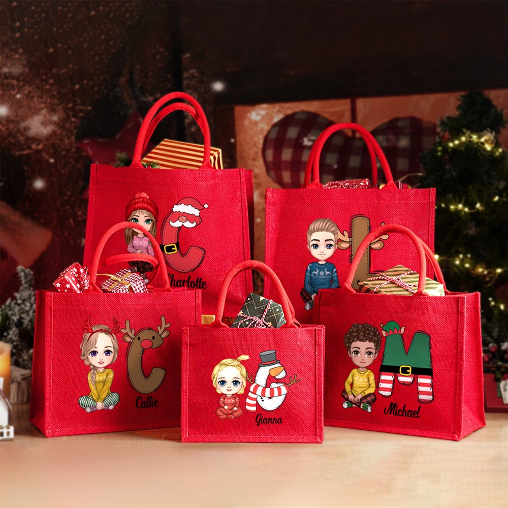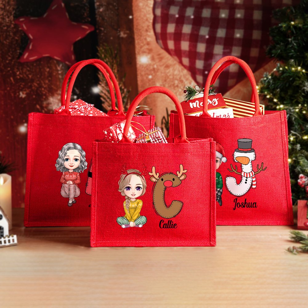 Denna röda tygväska visar en charmig seriefigur tillsammans med en lekfull initial med jultema, som snögubben, renen, monstret och jultomten, vilket skapar en glad och nyckfull atmosfär. Den röda färgen är perfekt för att omfamna julstämningen; denna väska kommer att lysa upp varje firande.