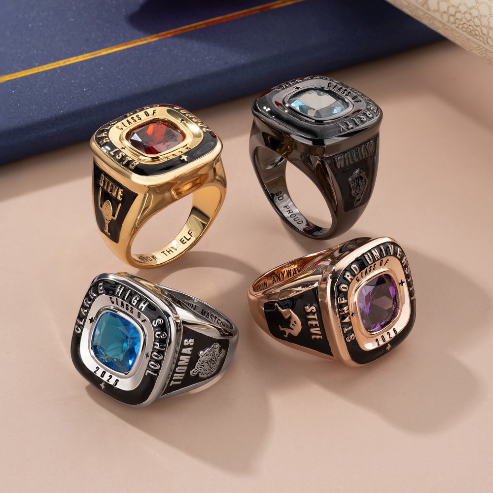 Minns och fira din examen med denna unikt designade klassring. Den är skräddarsydd för dig och gör att dina minnen från high school och college varar resten av ditt liv! Detta är också den sötaste presenten för män som tar examen från high school eller college.