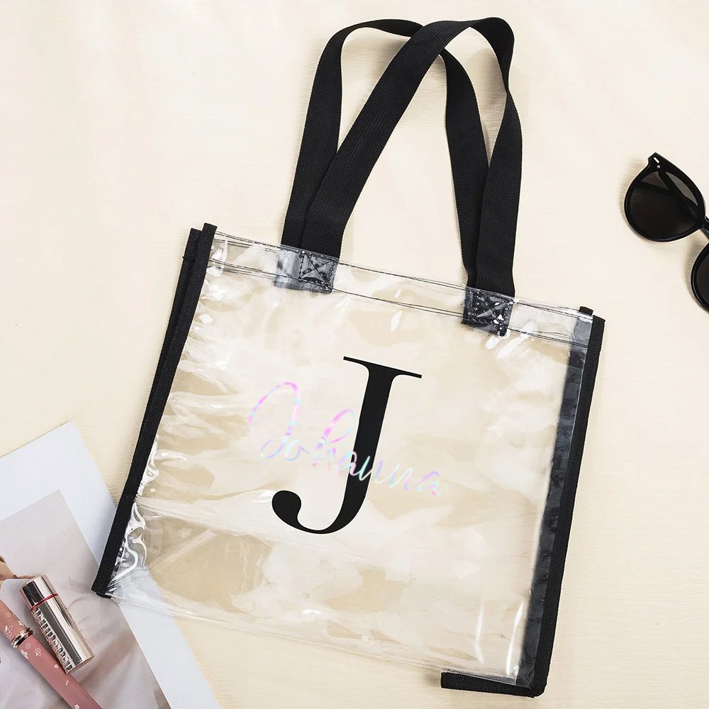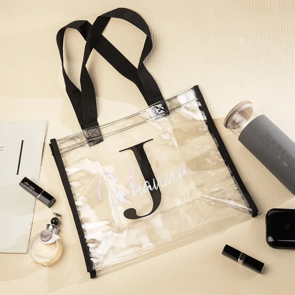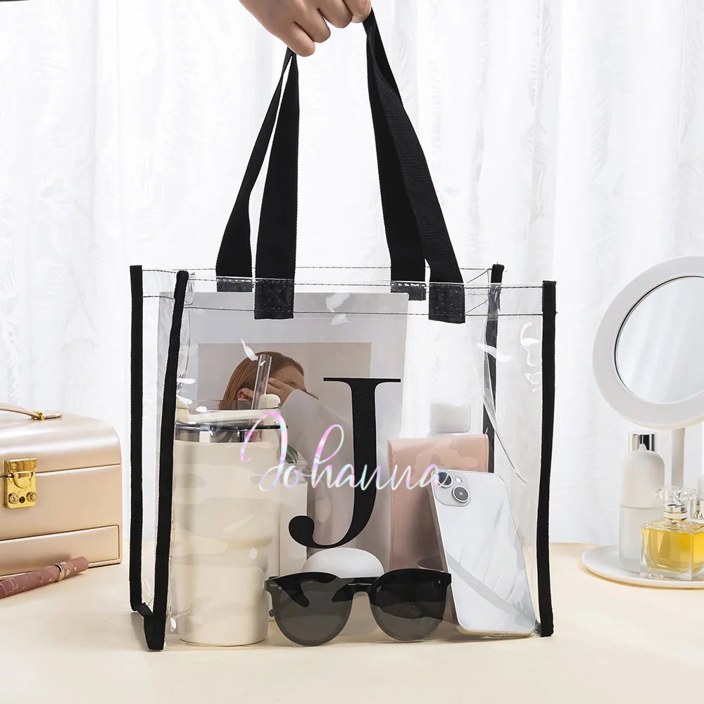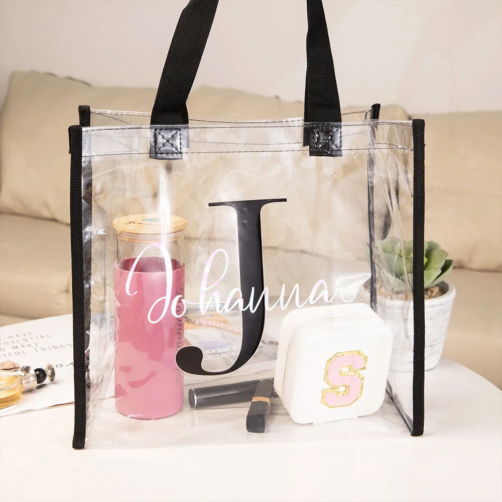Denna genomskinliga tote bag är praktisk och funktionell. Med måtten 30x15x30 cm rymmer den allt du behöver för en dag ute – som telefon, plånbok och solglasögon. De stadiga handtagen gör den bekväm att bära, och den genomskinliga designen gör att väskan är enkel att inspektera vid säkerhetskontroller om det behövs.