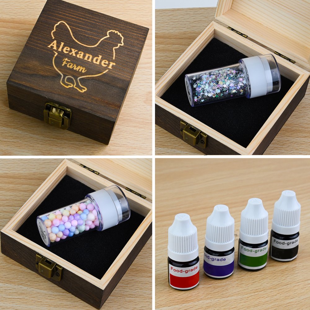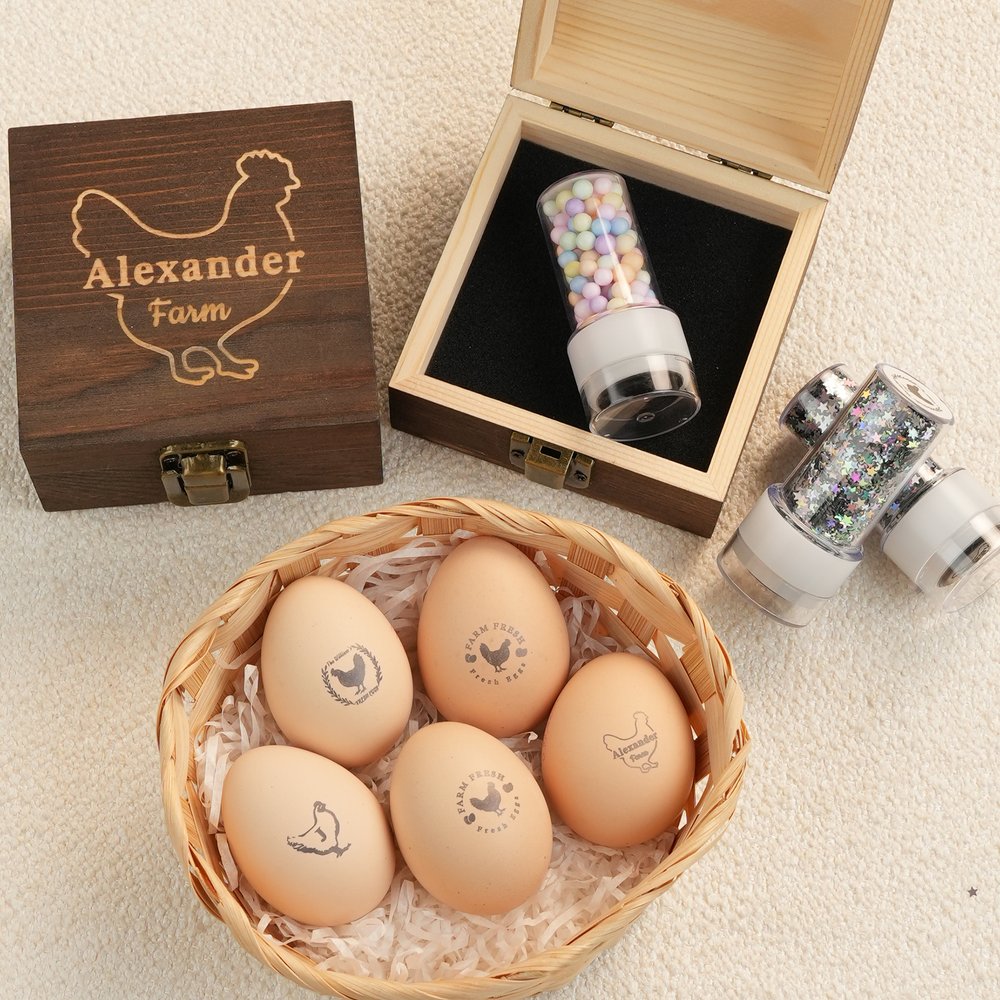 Denna äggstämpel har en charmig design fylld med färgglada sfärer eller stjärnformad glitter, centrerad kring gårds- och äggmotiv. Du kan anpassa den med ditt gårdsnamn och förvandla vanliga äggetiketter till unika symboler som förbättrar visningen av dina ägg samtidigt som de återspeglar din stolthet som jordbrukare eller uppfödare.