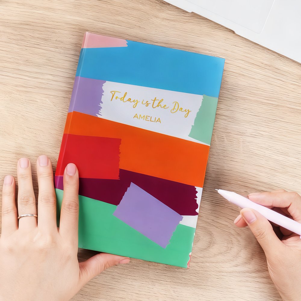 Den här anteckningsboken är centrerad kring livfulla färgblockeringar och har lekfulla, tejpinspirerade mönster som känns som att "klistra" en dos daglig glädje på omslaget. Med anpassade texter blir det en personlig tillväxtdagbok - varje gång du öppnar den är det som att få en mild knuff för att omfamna dagen. Den livliga färgblocksdesignen gör att även att-göra-listorna känns lätta och pigga, vilket gör vardagsplaneringen till en kreativ ritual.