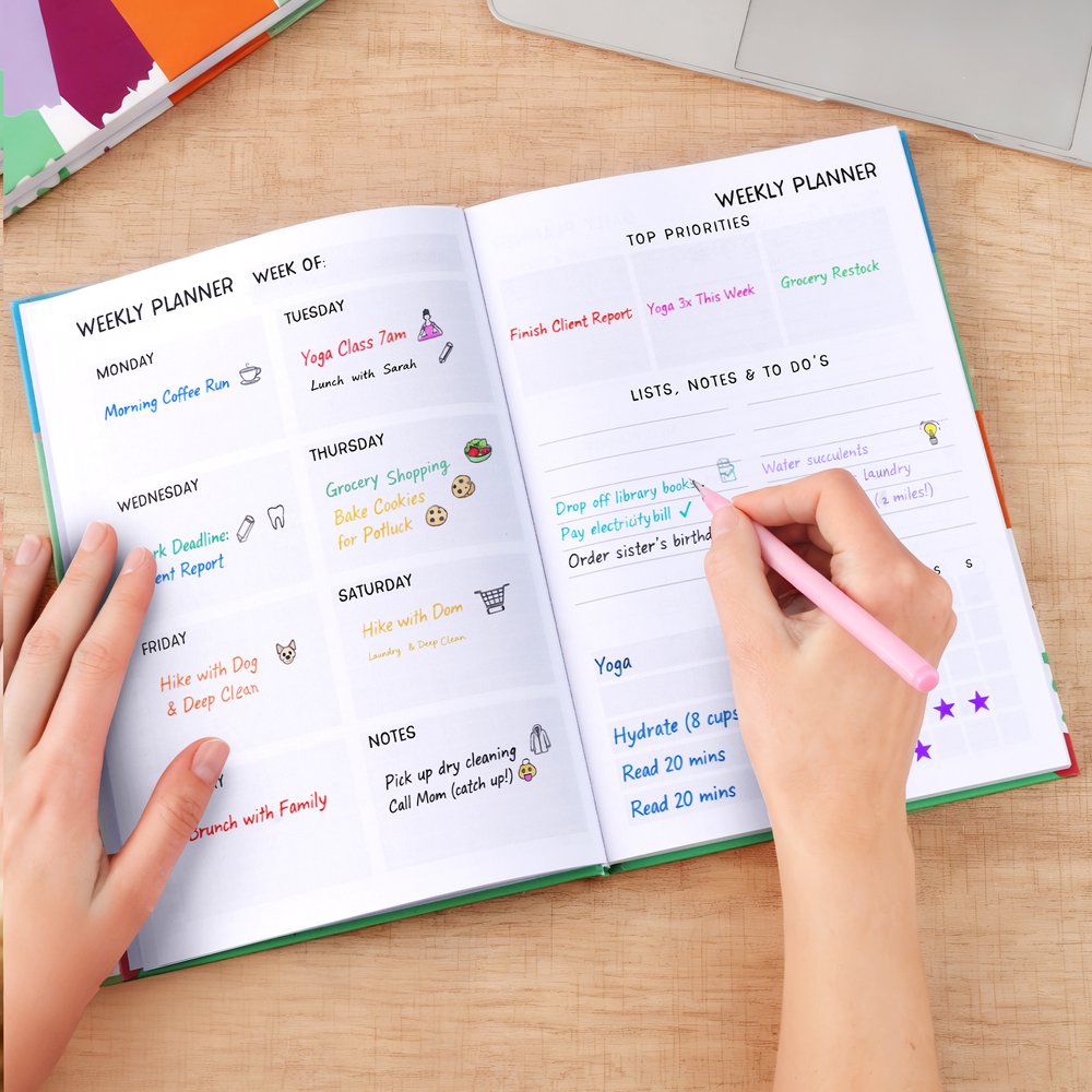 Perfekt inför nyår, skolstarten eller som en genomtänkt present till alla som älskar att hålla ordning - vänner, studenter eller tidshanteringsentusiaster. Det här är inte bara ett produktivitetsverktyg; det är en följeslagare som gör att du lever bra. Varje avsnitt är utformat för att ge klarhet, och varje färgblocksdetalj utstrålar positiv energi, vilket gör att mottagaren känner sig verkligen sedd och uppskattad i sin dagliga rytm.