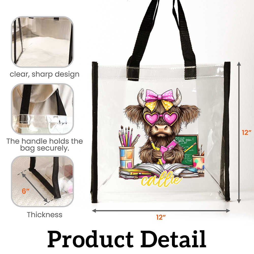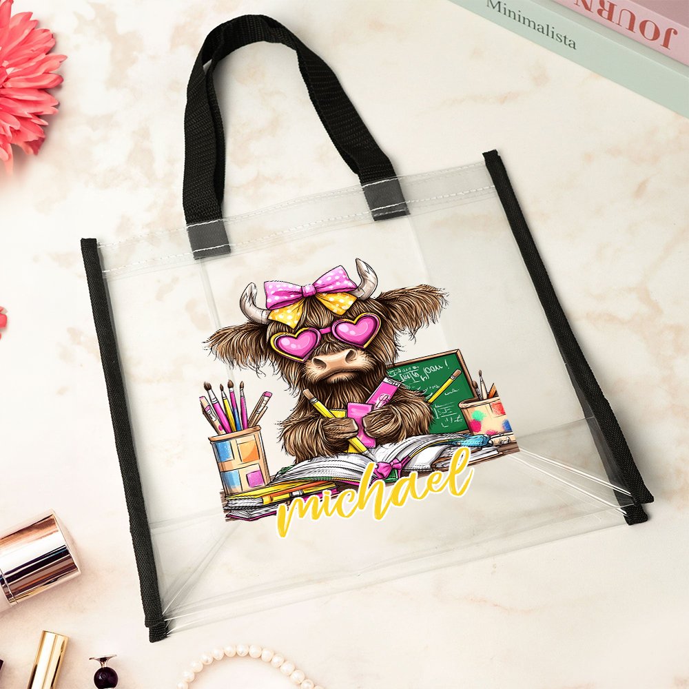 Personlig Coquette Bow Highland Cow Vattentät Clear Tote Bag med namn Barnens dag Tillbaka till skolan Födelsedagspresent för lärare Student