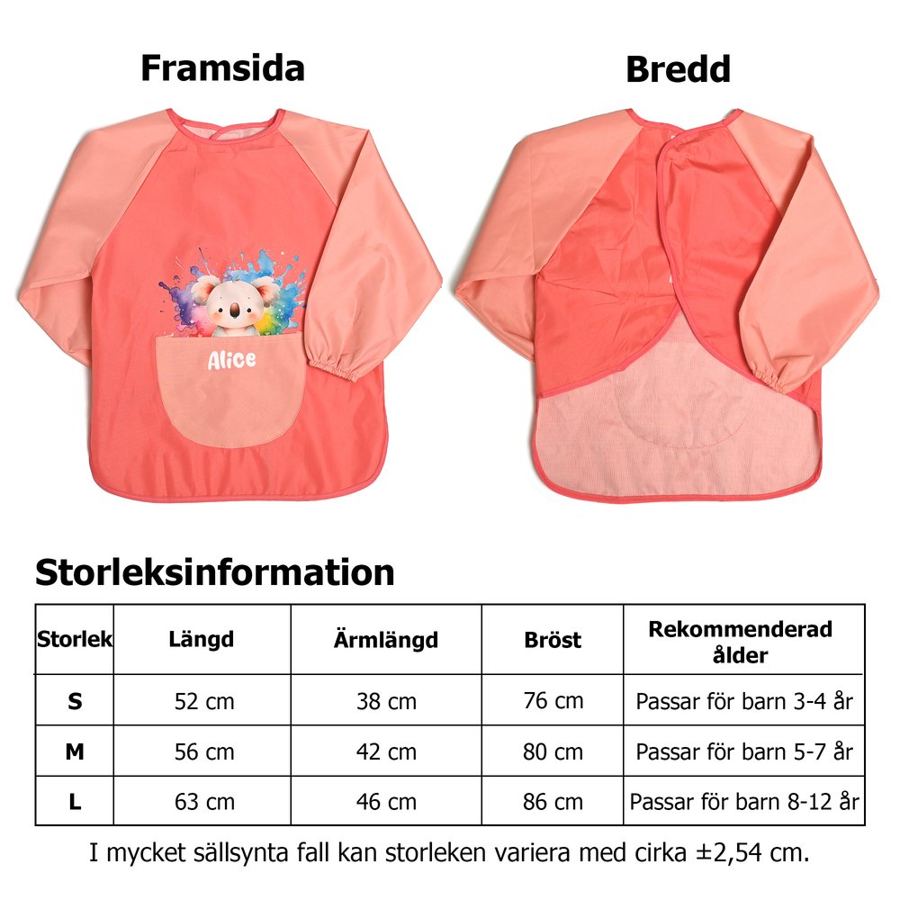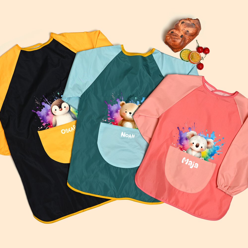 Detta förkläde har ett charmigt tema med söta djur på en akvarellbakgrund. Välj mellan 38 olika djurmotiv och gör förklädet extra personligt genom att lägga till barnets namn i fickan – perfekt för att väcka kreativitet och självkänsla.