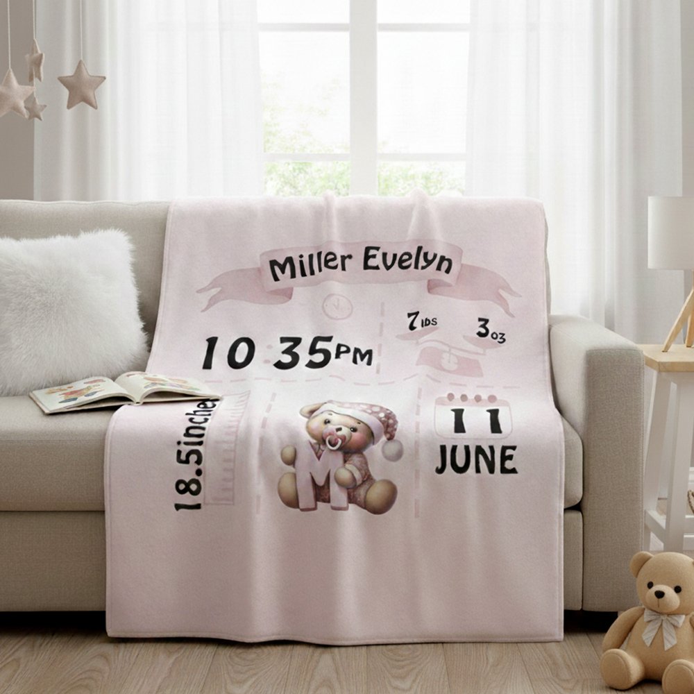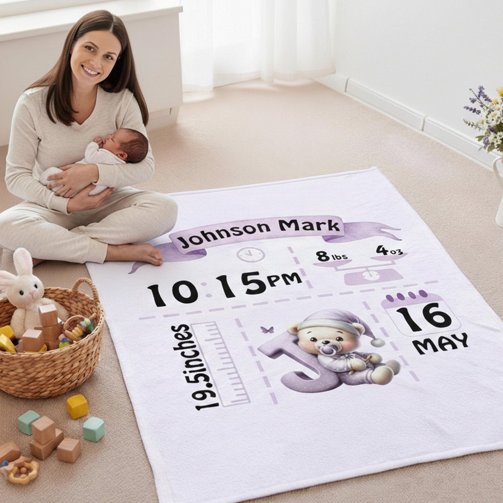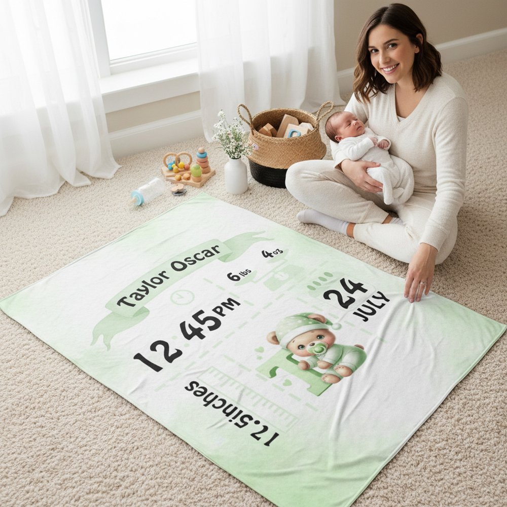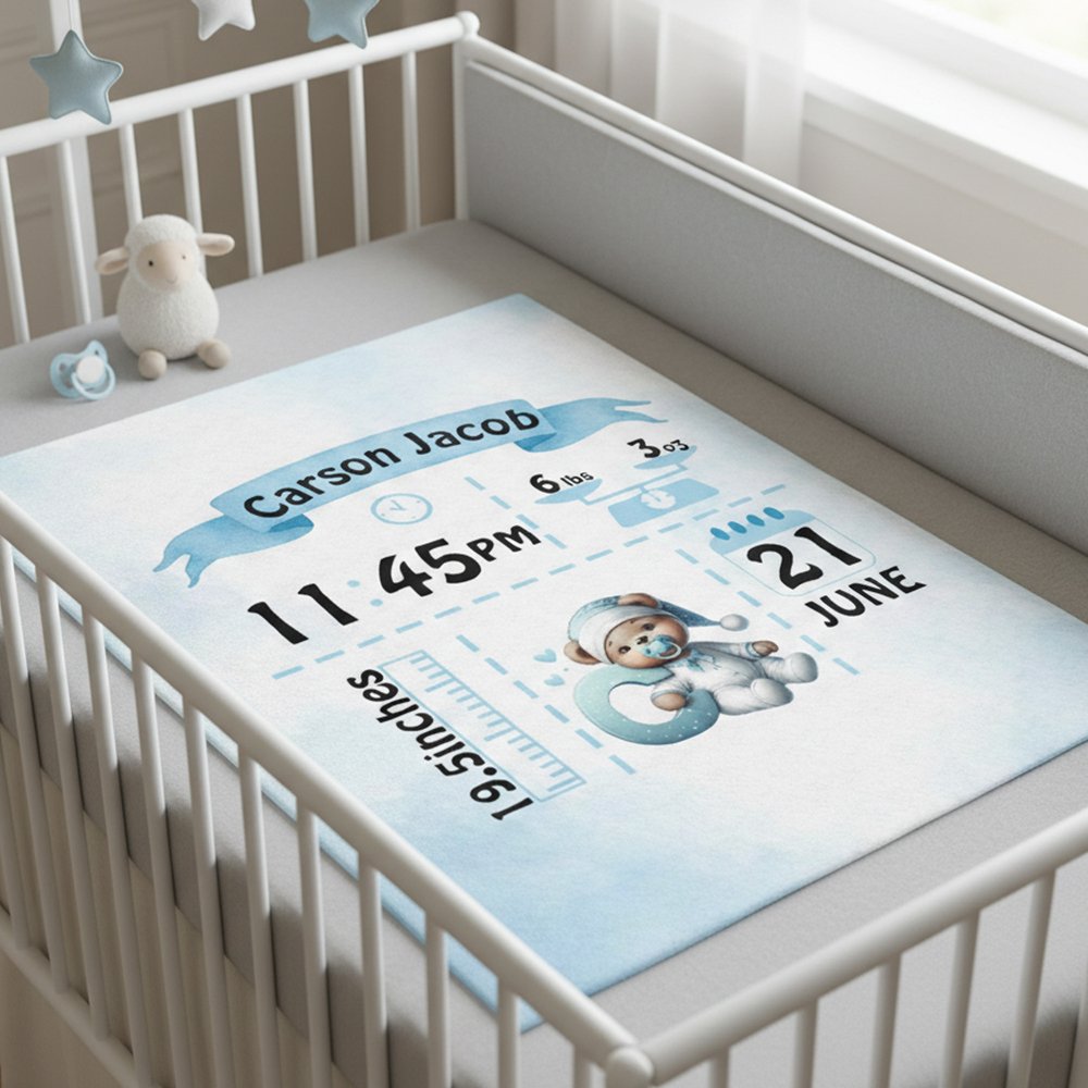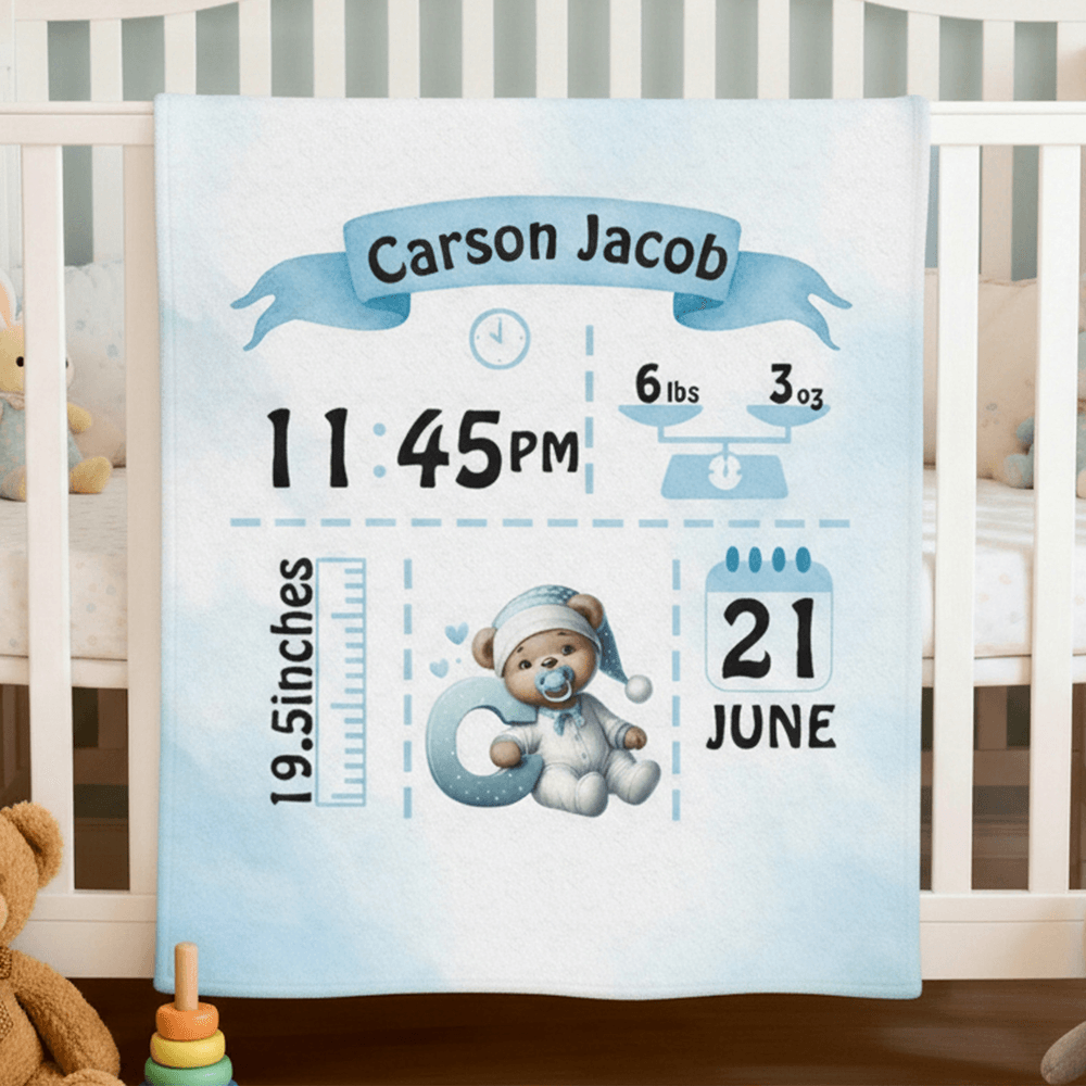 Du kan skapa en unik filt med födelsestatistik genom att ange ditt barns namn, längd, vikt, födelsedatum och födelsetid. Välj bland en rad mjuka bakgrundsfärger och matchande nallebjörnsdesign för att återspegla ditt barns unika personlighet, vilket förvandlar en enkel filt till en hjärtlig hyllning som bevarar magin i ditt barns första ögonblick.
