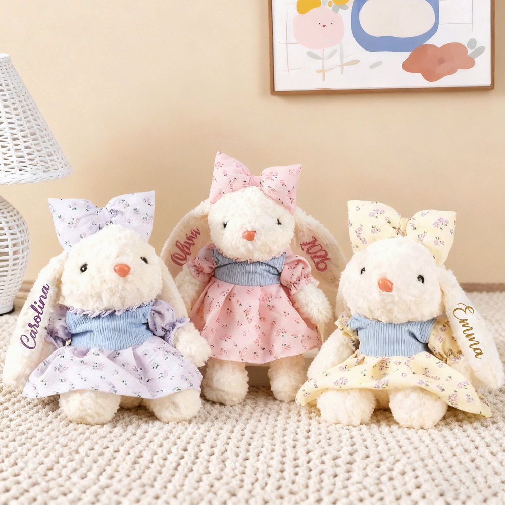 Varje kanin skräddarsys med barnets eget namn i ett vackert, glittrigt tryck på örat. Det gör denna mjukis till mycket mer än en vanlig leksak - det blir ett exklusivt barndomsminne som visar extra omtanke och kärlek.