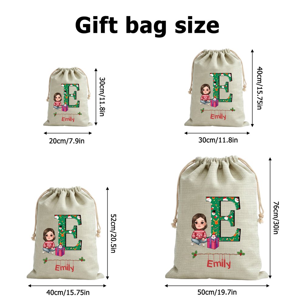 Personlig julklappspåse med söt tecknad karaktär och dragsko med initialer och namn Julklapp till barnfamilj